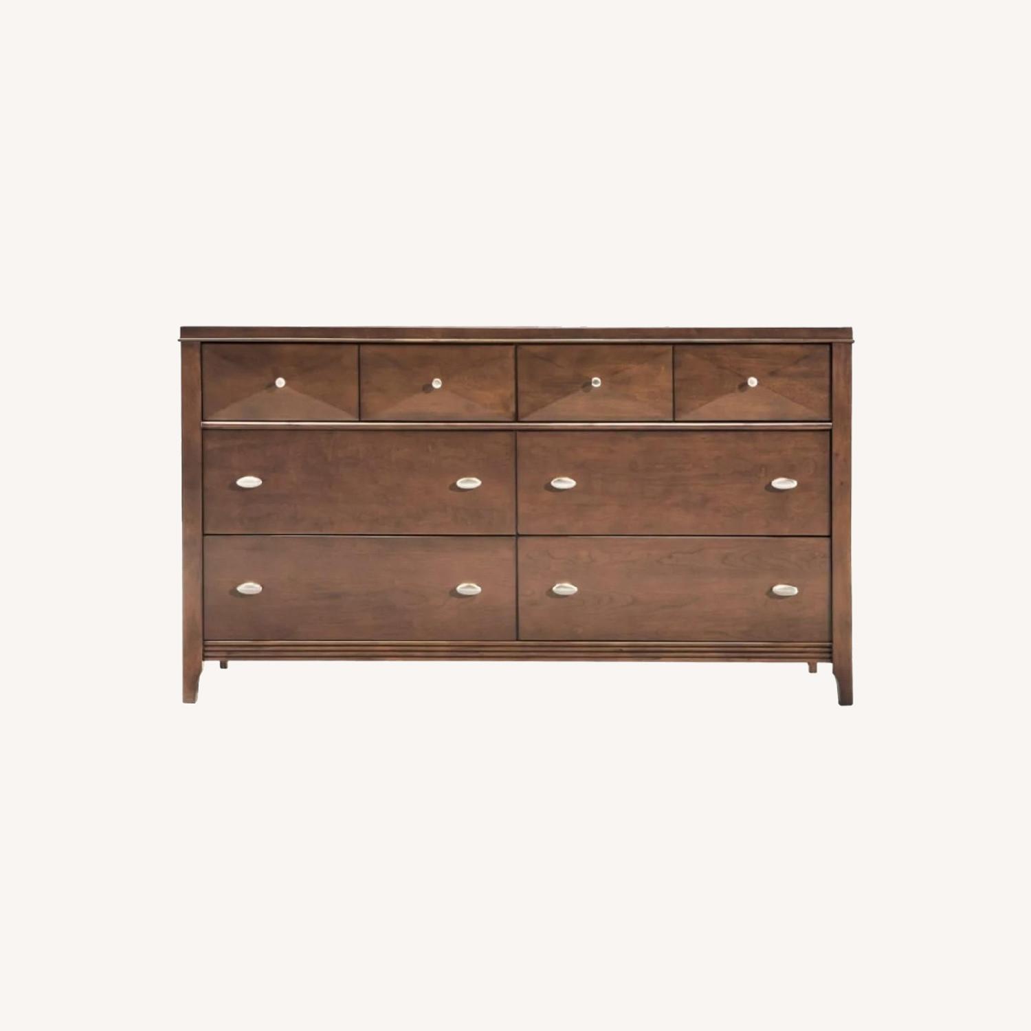 Seller's Notes:A European cherry finish and a simple contemporary design come together to create the sophisticated style of this Shadow bedroom dresser. With the raised diamond-shaped accent design and brushed nickel hardware, this dresser will transform your home with its rich style. It's a great start to creating the elegant and comfortable bedroom of your dreams.Dresser is carefully crafted of warm cherry veneers over select hardwoods that are extra strong and durable for years of beauty