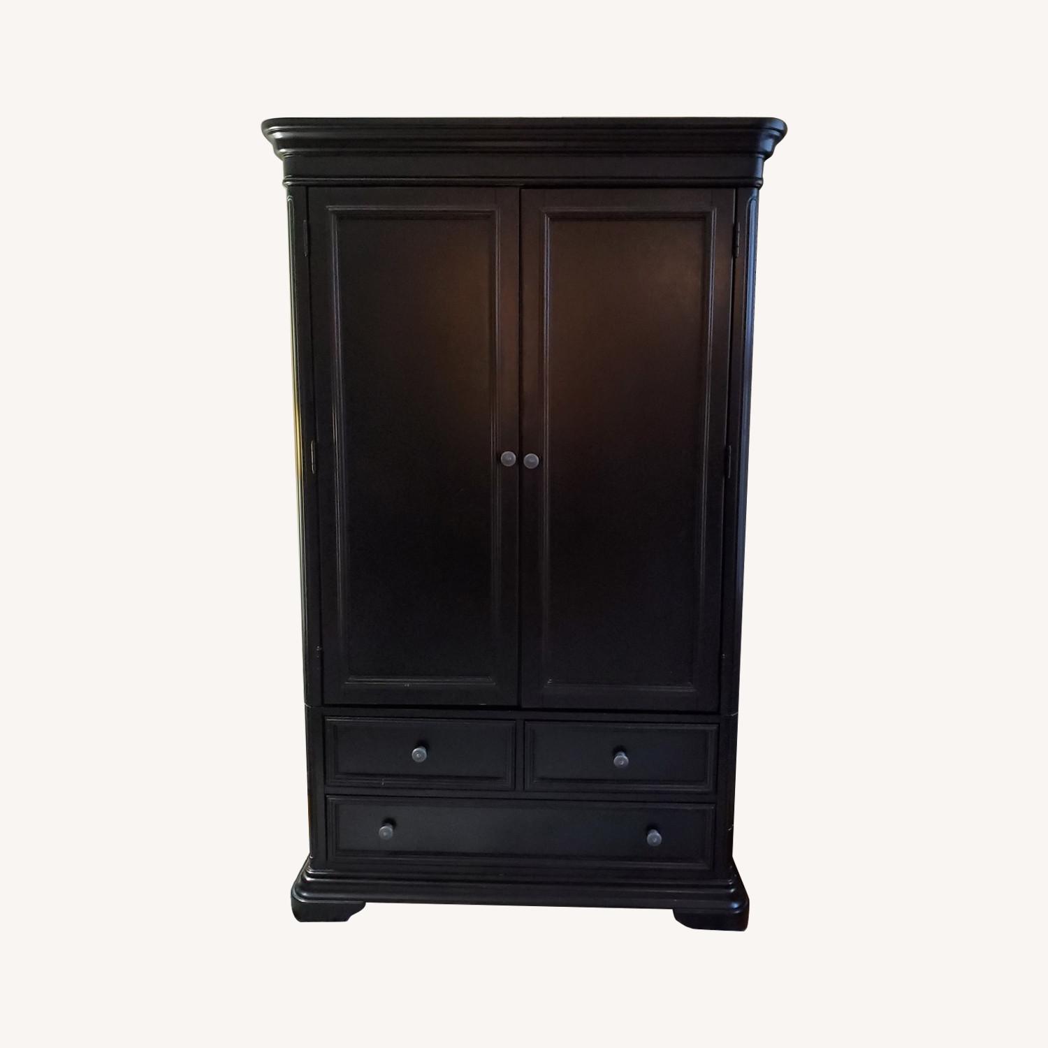 Seller's Notes:Purchased new from Raymour and Flanigan ten years ago. This item has been used as a wardrobe closet and now it's used for additonal storage. The armoire includes a bar and four removable shelves. It is quite versatile and sturdy. The color of the armoire is espresso with red undertones. Minimal scratches.