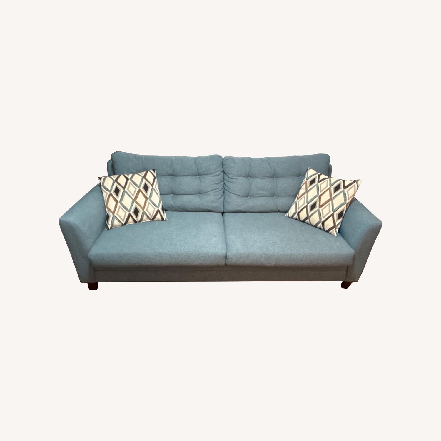 Seller's Notes:Lovely blue couch purchased less than 2 years ago. Remains in great condition. Parting ways with it due to moving out of state. From listing: Add a splash of color to your room with the Wexler sofa. This cool-colored sofa features button tufting and flared arms for a pop of style, while polyester upholstery is durable and incredibly family friendly.
