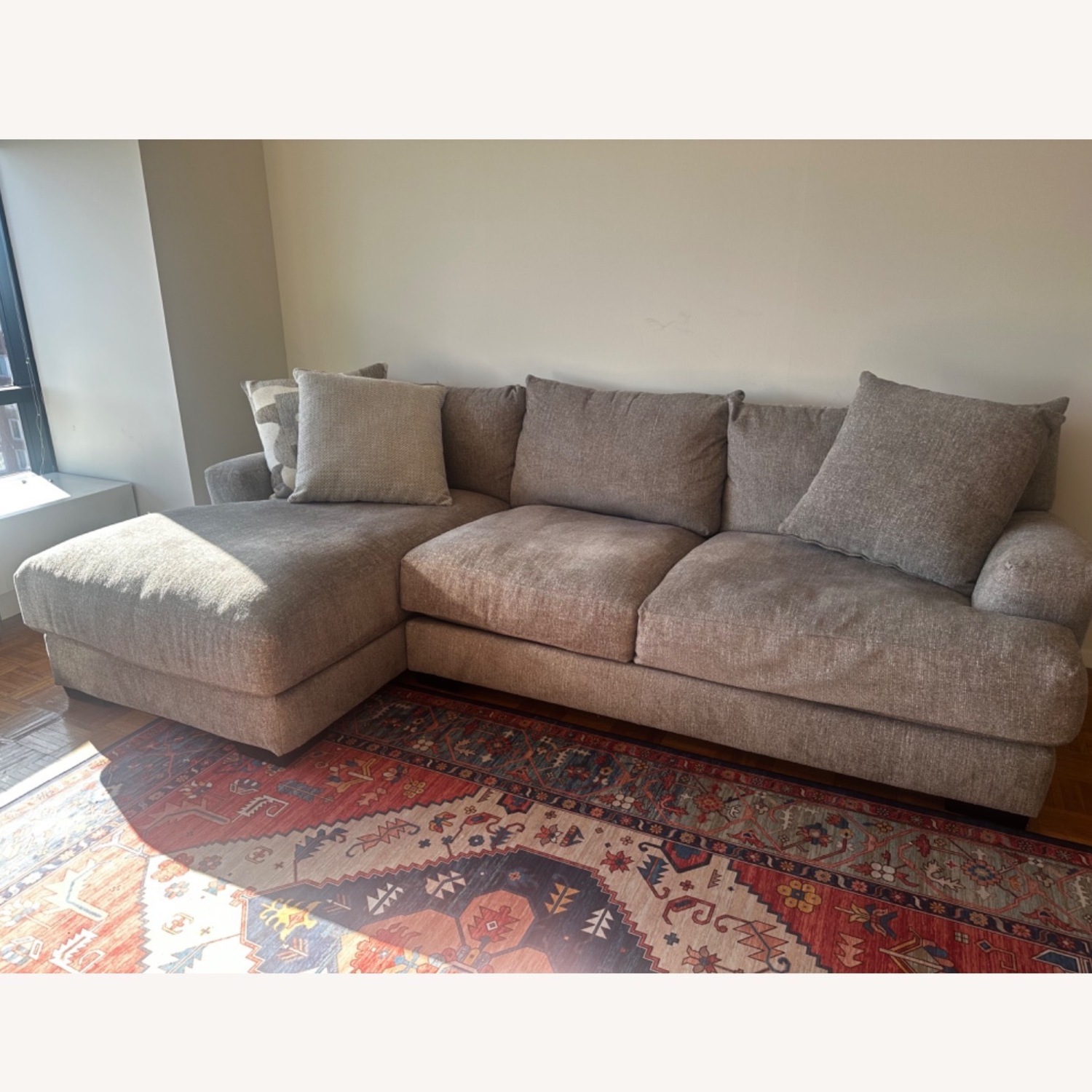 Seller's Notes:Raymour & Flanigan Carter Sectional for sale, like new and only a few months old. It’s a super comfortable grey sectional with deep seats, perfect for lounging, watching movies, or even sleeping on. It comes with decorative pillows and originally retailed for $2,200. The sectional comes apart into two pieces for easy pickup. Located at 72nd and York on the Upper East Side. The photos don’t do it justice, and I’m happy to do a video call if you’d like to see it. Message me for details. Moving out of state.