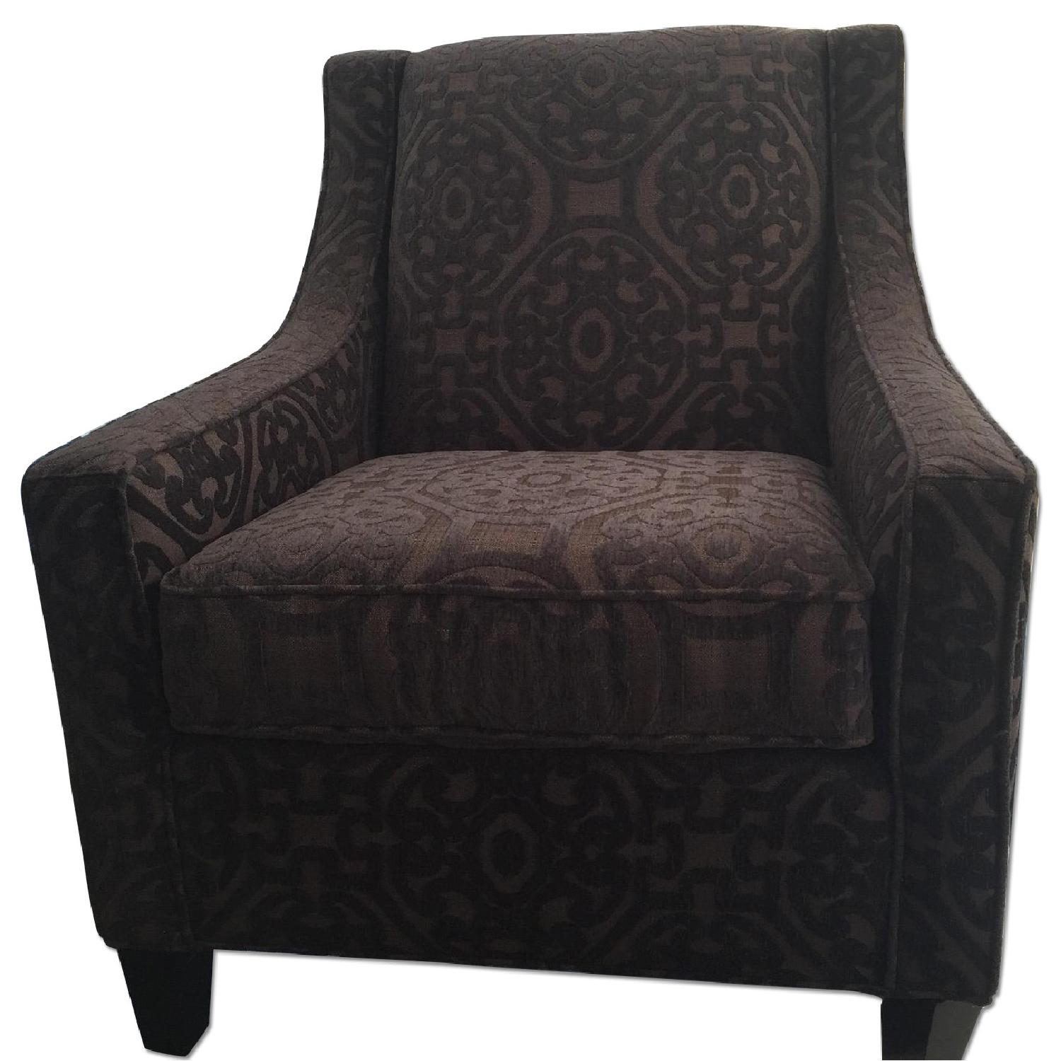 Seller's Notes:Give your living room some stylish extra seating with this Cindy Crawford Calista accent chair. Its elegant shape and luxe upholstery will bring a sophisticated look to your space. Plus, you'll love the eye-catching pattern. L: 32" x W: 37" x H: 38" The chair is as new and purchased for $679.