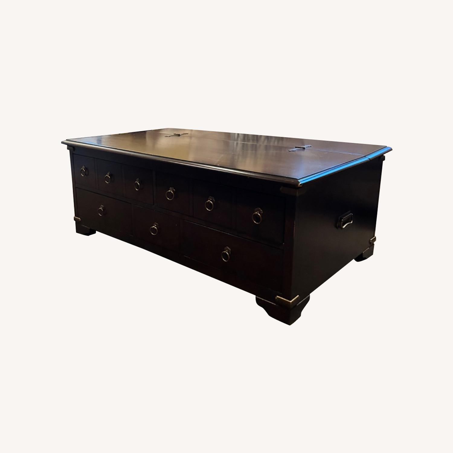 Seller's Notes:This coffee table has 5 drawers in the front and a lift up blanket storage compartment in the back. It has some scratches on top and nicks on the edge on the lift up compartment.