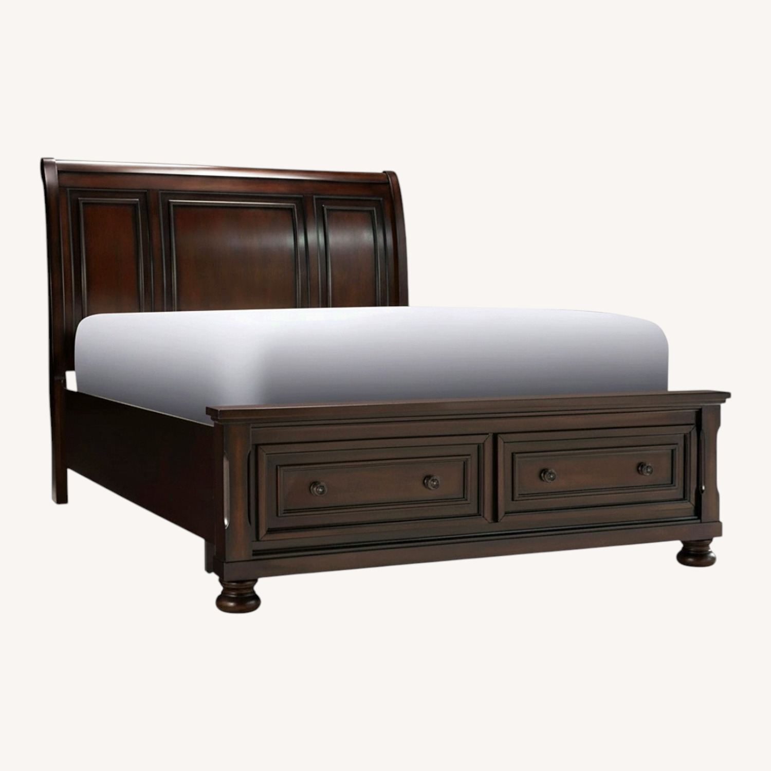Creating a cozy, restful retreat is easy with this Donegan Sleigh Platform Storage Bed. Along with its rich finish options, this sleigh bed's elegant details like antiqued hardware and bun feet, combine to deliver a timeless quality and a beautiful appearance. This bed is practical too, with 2 drawers built into the footboard that are perfect for storing clothes and blankets.