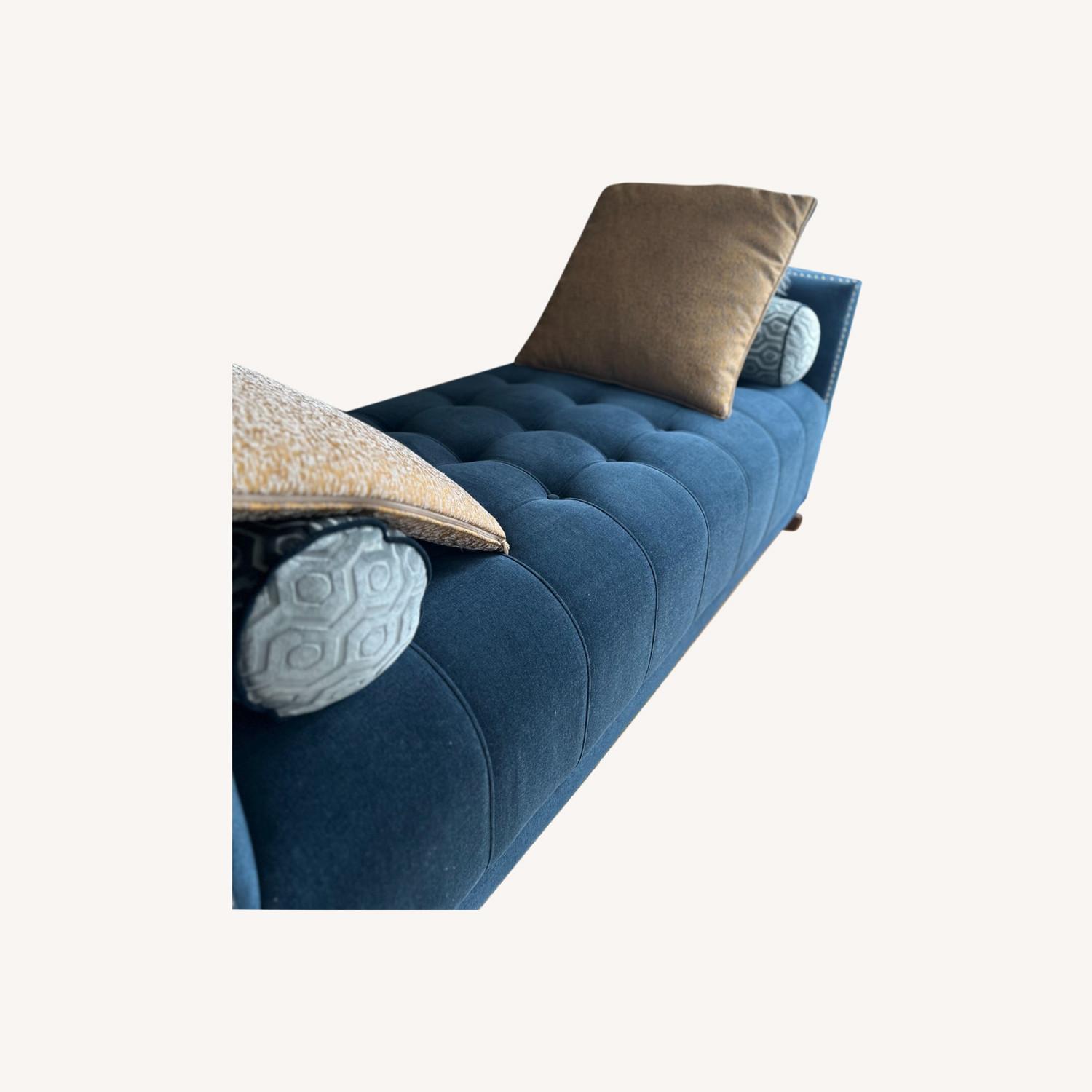 Seller's Notes:The Diana chaise is exotic, adventurous and glamorous. Rich hues in indigo and beautiful nailhead trim create a distinctive, unique and daringly sensuous look. Button-tufted velvet-look polyester adorns this piece, while beautifully patterned accent pillows add fabulous flair.