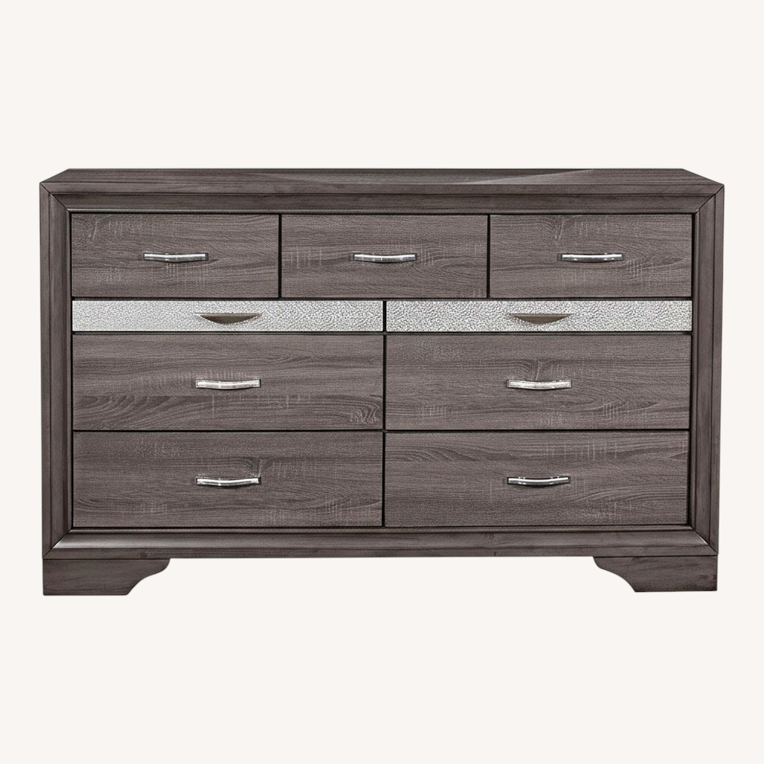 Visually stunning and elegant, the Seville Dresser fills a room with dynamic look and cozy appeal. Clean, modern design elements along with a fresh yet timeless look will transform your bedroom into a haven of serenity and style. Sold in a comfortable grey which make it a stress-free and easy way to coordinate countless room environments and decor choices. Features include roomy drawer space, silver-toned drawer front hardware, convenient jewelry drawers, and melamine detailing that enhance the graceful charm of this dresser. Quality craftsmanship in every detail ensures durability and long-lasting wear. The Seville dresser is the perfect solution in your quest to create a showcase of style and comfortable living in your home and will provide you with years of versatility and enjoyment.