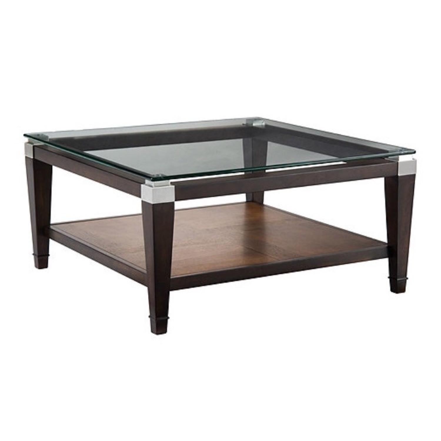 Seller's Notes:Raymour & Flanigan Dunhill coffee table Wood & glass Normal wear but glass is in perfect condition