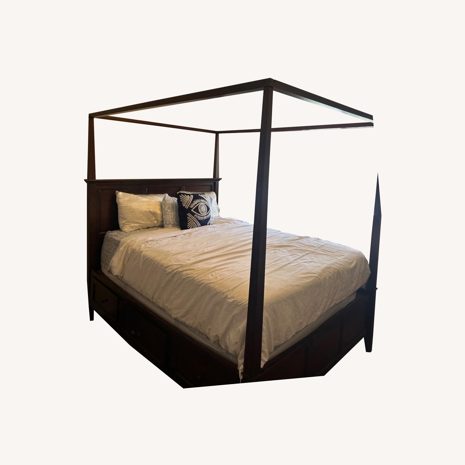 Raymour & Flanigan Espresso Wood Canopy Queen Bed w Drawers