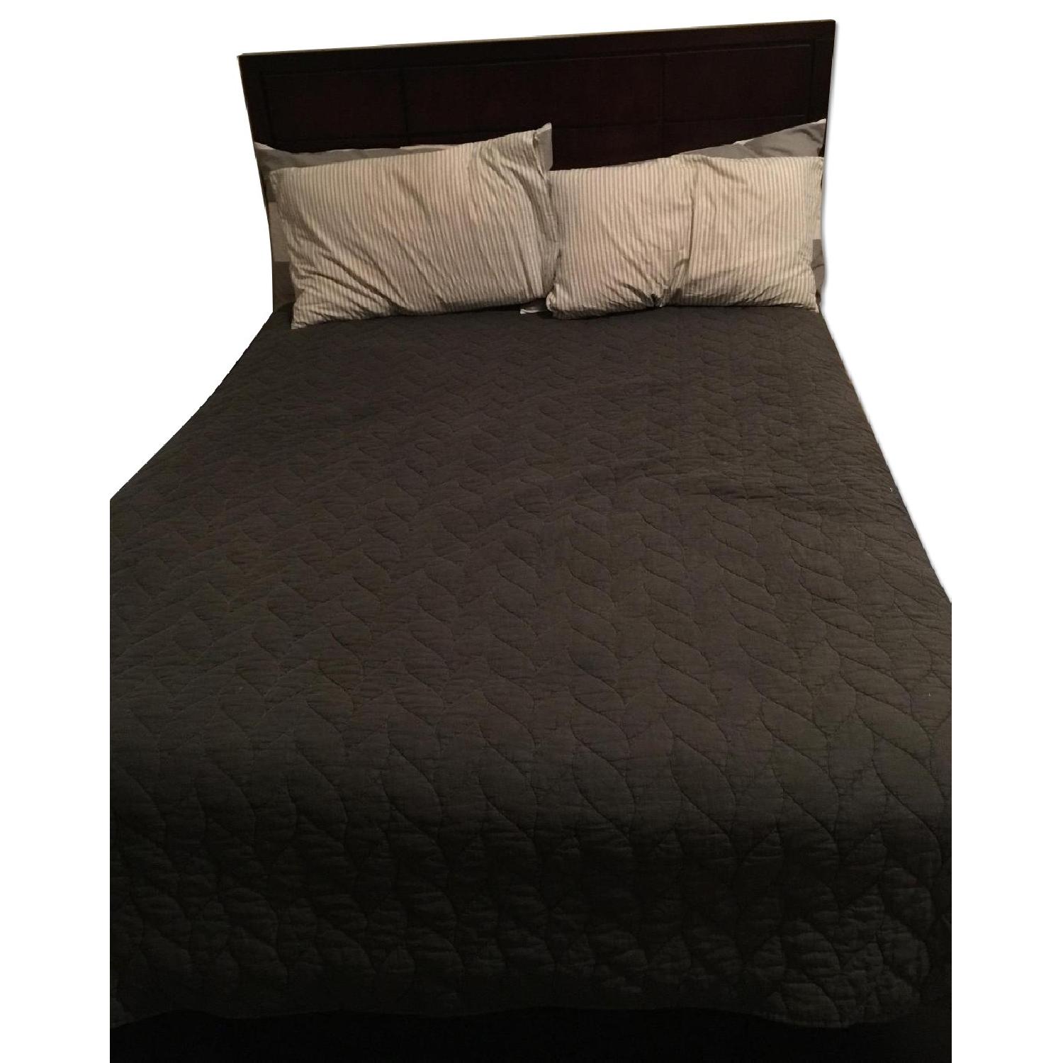 Seller's Notes:Walnut colored Queen headboard and bed frame Platform look, but requires a box spring Rectangular pattern etched into headboard, textured look Good condition, no noticeable scratches at all Selling to make room for a new bed frame 118 lbs