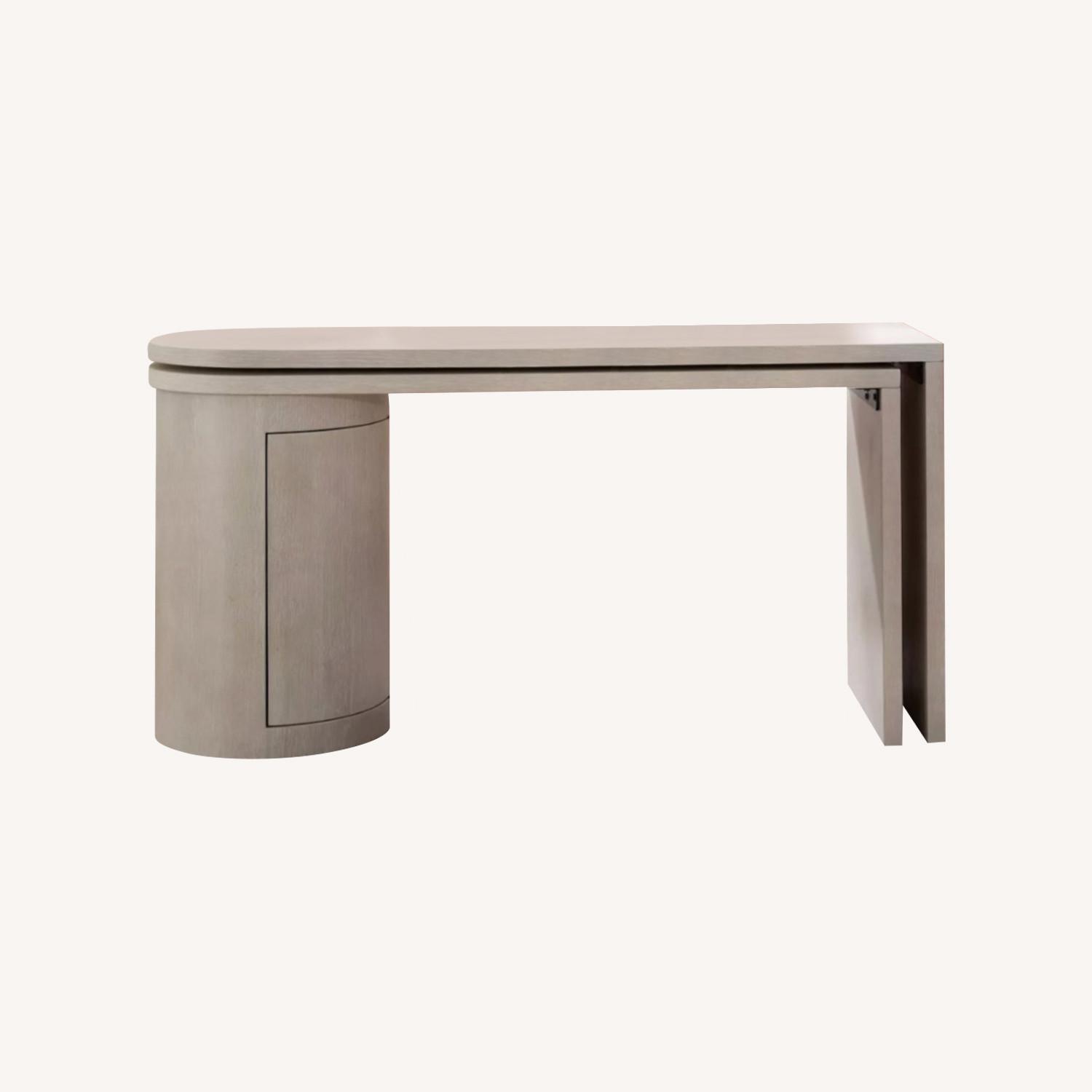 Seller's Notes:Brand new 360 degree expandable rotating swivel desk. It was delivered to my office on 8/18/2024. It's a stunning desk and beautifully made. It will last for years. The desk rotates 360 degrees- create an office desk, expansive executive desk, or angle as a corner desk Light sand whitewash ash wood Push open cabinet with one fixed shelf Dimensions: L: 64" x W: 20" x H: 32" Similar to: Pottery Barn Cayman L Shape Rotating Desk (TikTok famous!) Crate & and Barrel Whitewashed Ash Rotating Desk