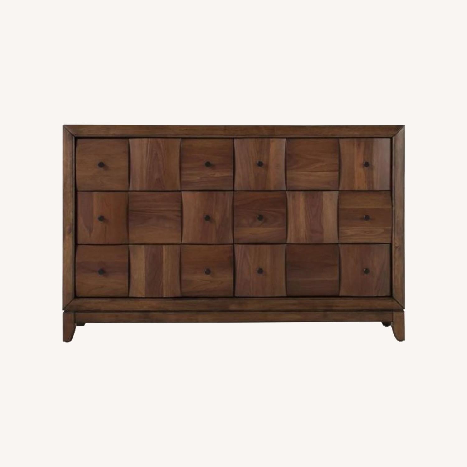Seller's Notes:Large dresser of light walnut color, has 6 drawers and felt lined in some of them. Basket weave pattern gives a unique design aesthetic. Only used for less than a year, excellent condition.