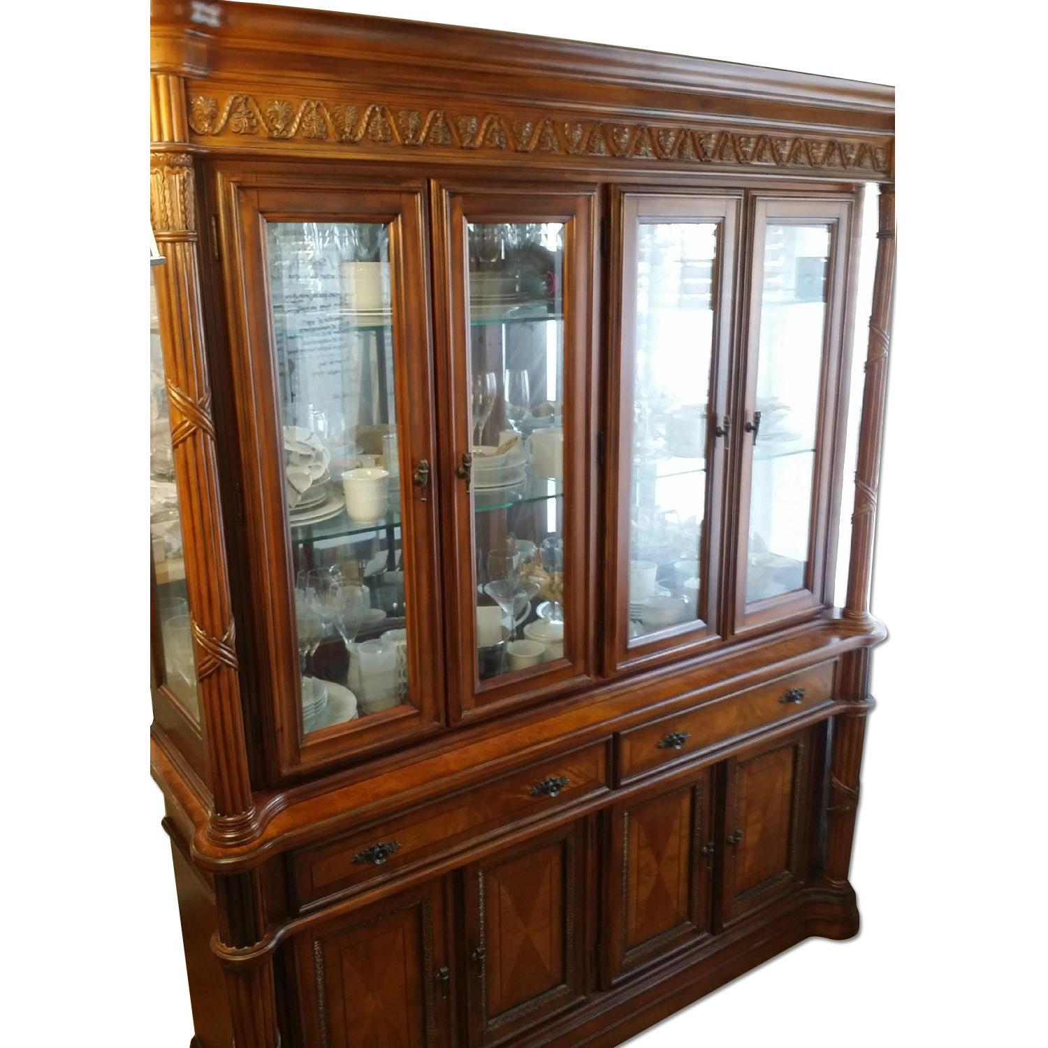 Seller's Notes:Beautiful solid wood china cabinet from Raymour & Flanigan Features: - Glass top with interior lighting - 3 glass display shelves inside the top - 2 velvet-lined drawers, great for cutlery sets and other tableware - 2 cabinets on the bottom with 2 shelves inside, wood inlay design and carvings on the doors - Oil rubbed bronze hardware - Intricate carvings throughout - Note that top can be detached from the bottom - In great condition, looks practically new - Happy to answer any questions or post additional photos if you'd like NOTE: I'm also selling the matching dining set (expandable table + 6 chairs) separately/