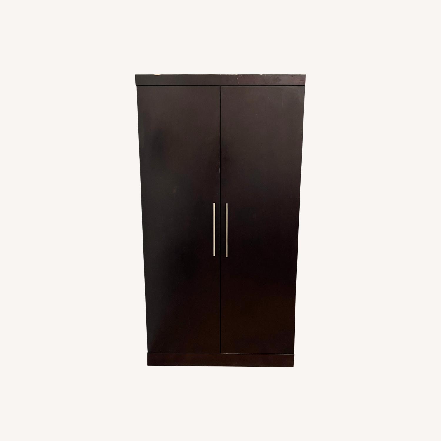Seller's Notes:VERY sturdy, holds LOTS of clothes and shoes - this is great for apartment-style living in tiny city spaces. Acts as a closet and great storage space. I've been very happy with this piece, but it won't fit in my new apartment. Note: this piece is quite heavy and durable. Some chips and scratches from transport. Dark espresso brown color wood. Mirrors on both sides / inside doors.