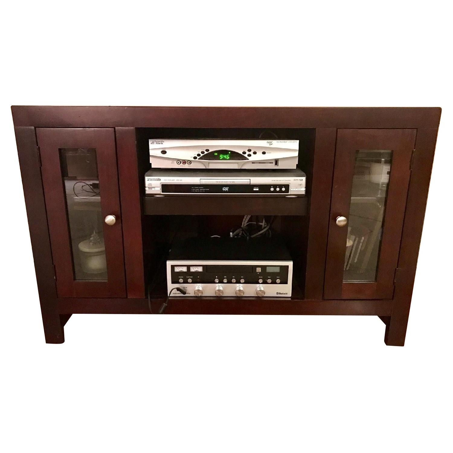 Seller's Notes:Looking to redecorate and looking for something bigger. Features: -3 Cutouts provide easy cable management and ventilation for your TV and A/V components -Adjustable shelf behind each of the 2 wood-framed glass doors and an open center area with an adjustable shelf