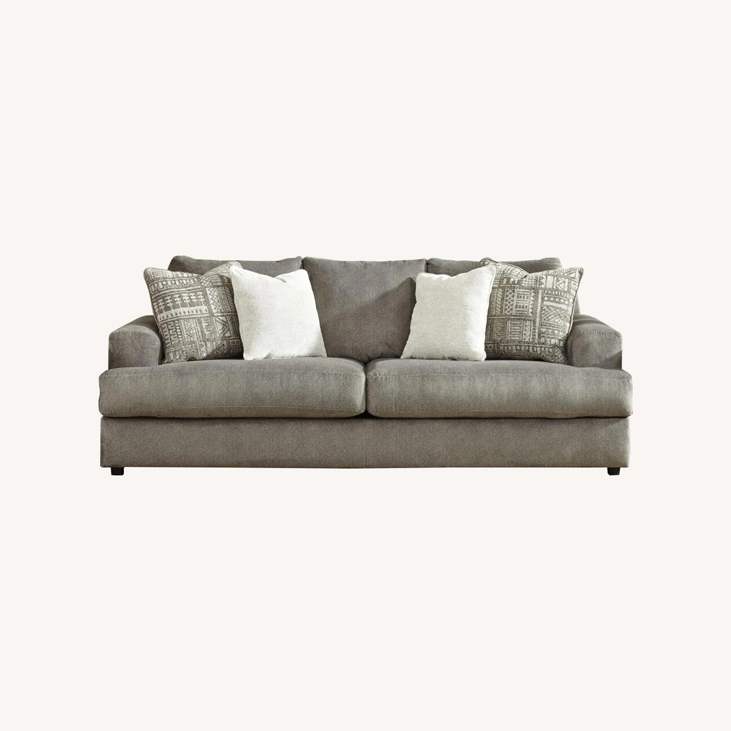 Flaunting a trendsetting silhouette, the Soletren sofa puts the contemporary in your home. Its "three over two" profile eliminates the center seat cushion, giving you elongated plushness and deep seating. Chunky chenille fabric satisfies your need for a piece that feels as good as it looks. Accented with soft jacquard chenille throw pillows for a splash of geometric pattern and color contrast.