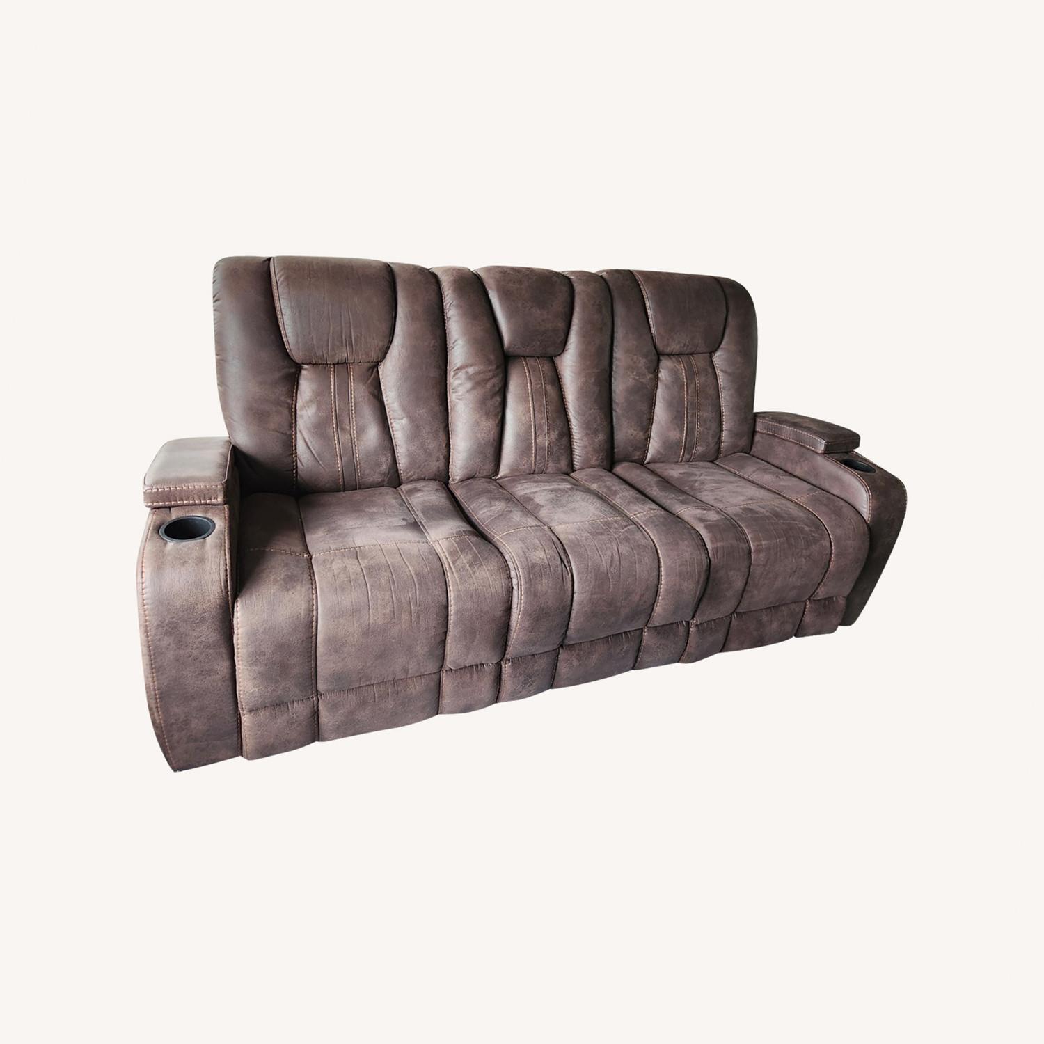 Seller's Notes:Upgrade your living room with my stunning two-year-old, dark brown reclining sofa that offers the perfect blend of comfort and convenience. This exceptional sofa features three spacious seats, two of which are equipped with smooth reclining mechanisms that allow you to find your ideal lounging position. But that's not all—this sofa is loaded with smart features to enhance your relaxation experience. It boasts built-in charging ports, ensuring that your devices are always powered up and within reach. Plus, the convenient cup holders let you enjoy your favorite beverages without the worry of spills. Even better, the sofa comes with an integrated light, adding a touch of ambiance to your space. Despite its age, this sofa is in remarkable condition, with only minor wear that adds character. Don't wait any longer to elevate your living room—bring home this incredible dark brown reclining sofa today!