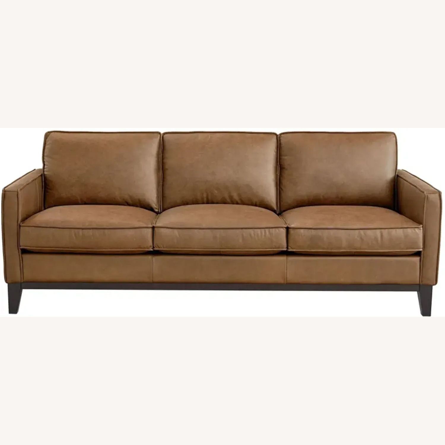 The Roscoe leather sofa blends post modern design with contemporary style. Its track arm design features a distinctive pie crust stitching detail and is upholstered in a luxuriously soft 100% top grain leather in Chelsea Honey. Each piece has a 360 degree solid wood base with tapered legs. A premier detachable cushion construction with pocketed coils and channeled 100% polyester fiber backs give the group a sumptuous level of comfort and durability. | Hardwoods with corner blocked frame construction100% LeatherTop-grain leatherSinuous spring support systemPostmodern designPie crust seamsTrack armsExposed solid wood base1.8 seat cushion densityFully padded and reinforced outside arms and outside back | Welted;Online Only