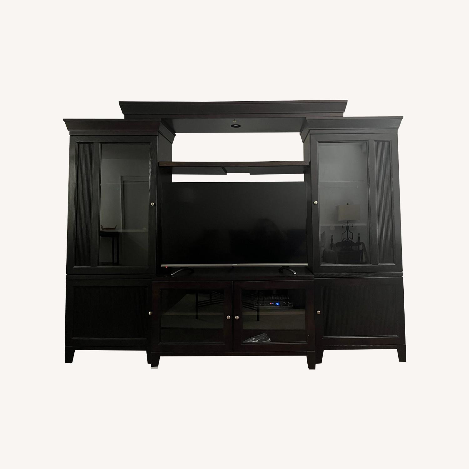 Seller's Notes:I AM MOVING AND MUST SELL BY TUESDAY SEPT 9. 5-piece, dark brown wall unit includes 2 media piers with adjustable glass shelves and cabinets, a tv console, top floating bridge and shelf. Lights inside the cabinets and above the top shelf. Purchased new from Raymour & Flanigan. The TV console is 46 x 20.5 (Fits 50" TV). The cabinets have DVD racks that are removable for a more up to date use. Minor blemishes that most people won’t notice and can easily be touched up. Can include original assembly instruction manual.