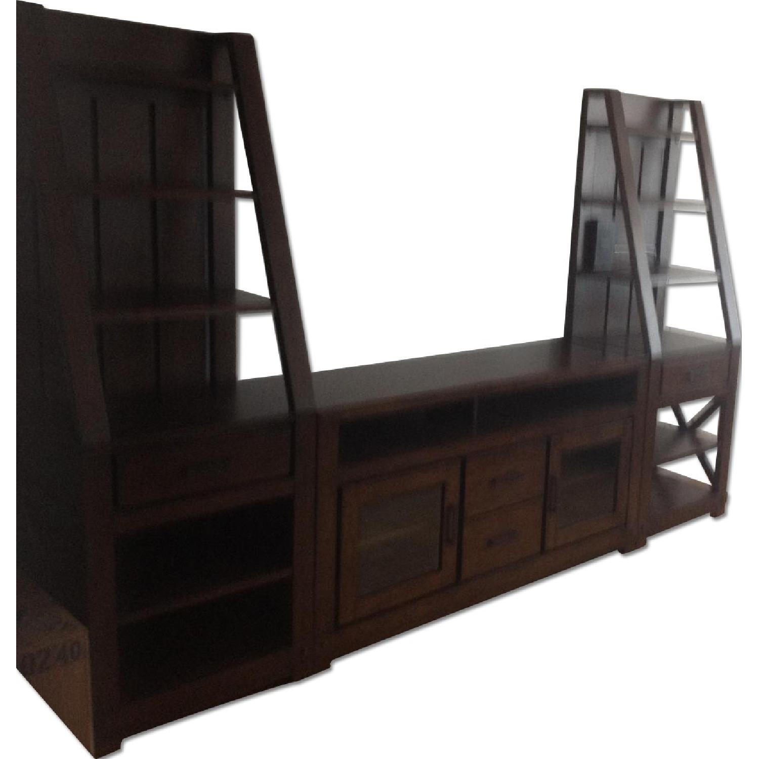 Seller's Notes:This entertainment center is carefully crafted from ash solid and engineered-wood framing. It includes left and right detachable bookshelf piers, and a TV console that fits most flat-panel TVs up to 60 inches. We are only selling this entertainment center because we are moving into a much smaller apartment and sadly can't take it with us.