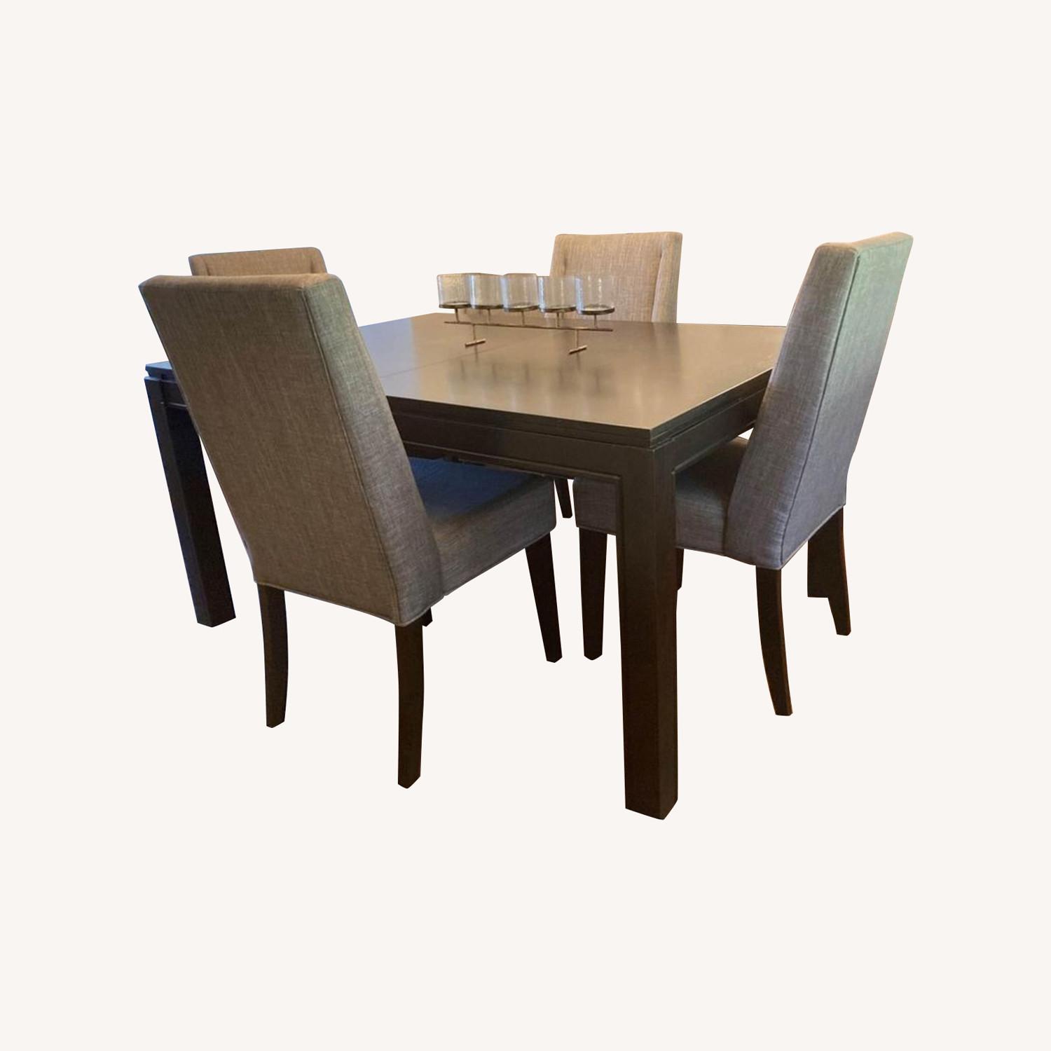 Seller's Notes:1.5 year old Raymour & Flanigan table and chair set that comes with 18" leaf. Each chair is covered in linen-look upholstery. Like new condition -- unable to move into my new house.