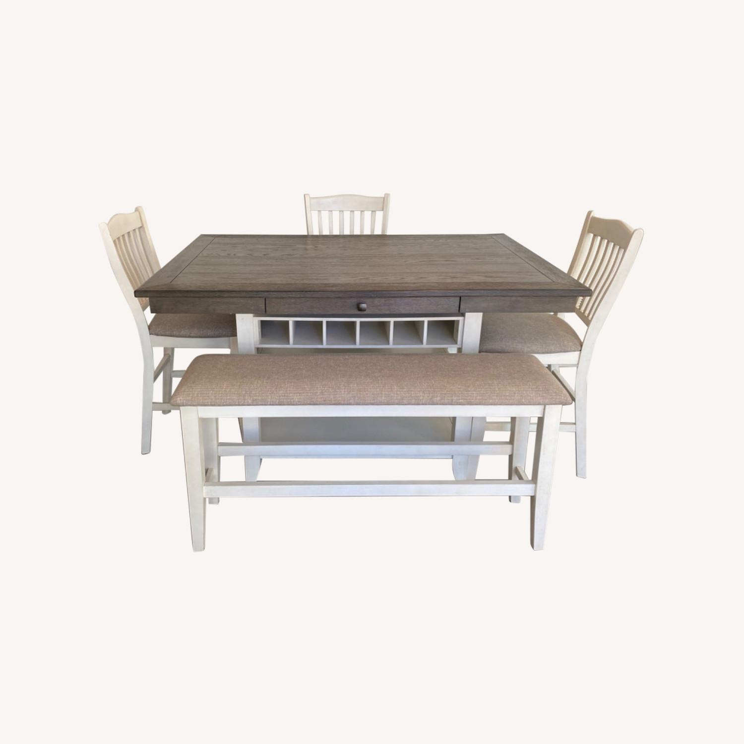 Seller's Notes:Aside from a little wear and tear this table very structurally sound and at a glance still appears like new. It has had minimal usage aside from being a catch all. Therefore the seat cushioning is almost like new. There are some surface scratches on the table top. (Phots included). There are 2 spots that have had some adhesive boding that caused staining and or has been sanded leaving some scratches. Both of these areas are in locations are mostly out of sight. 1 spot is located within one of the 2 drawers. The other spot is located on top of the wine bottle cubbies. The table is symmetrical and has drawers on both Sides.