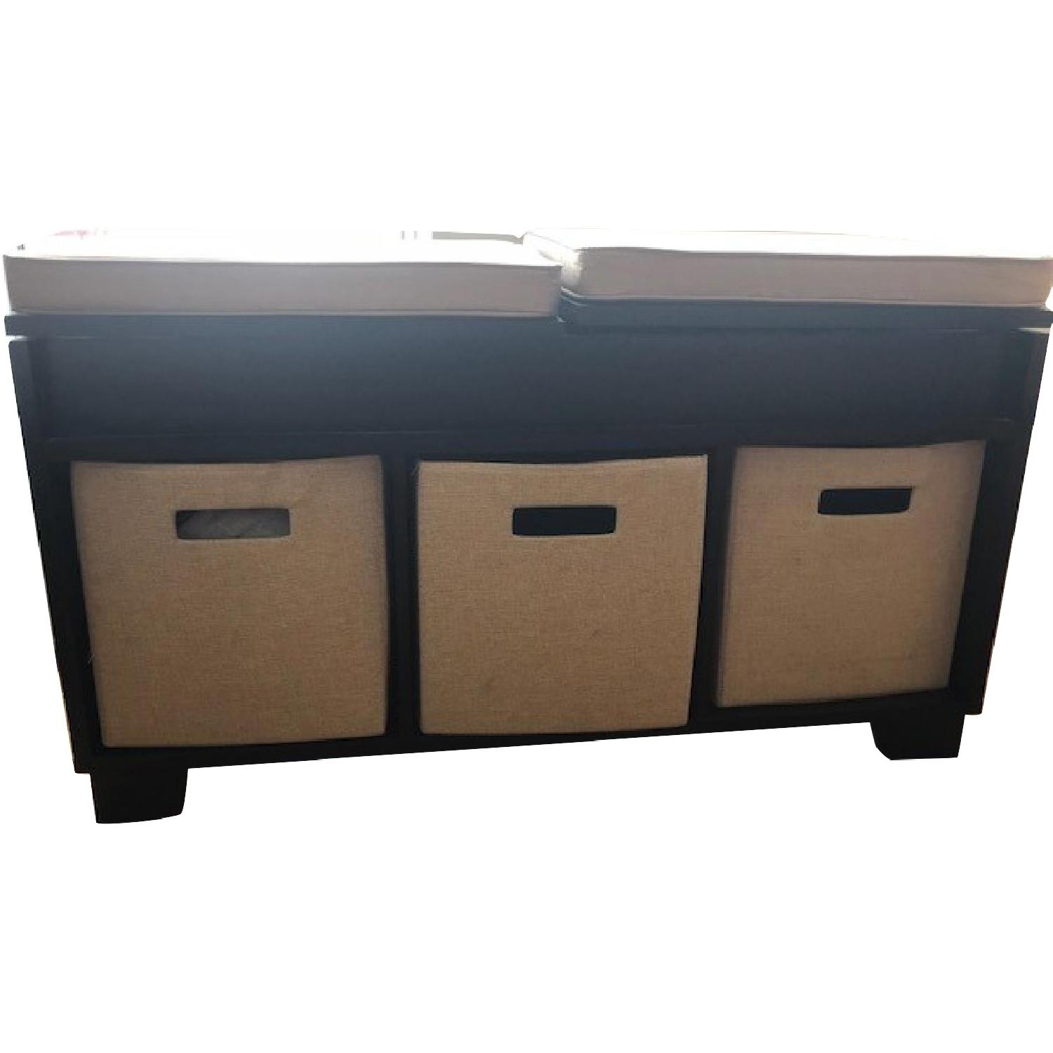 Seller's Notes:Attractive storage unit with 3 baskets as drawers, plus cushioned seats on top that open up to an additional shallow storage space. Sold at Bed Bath & Beyond. We have the "espresso" color. -3-cube compartments provides a customizable storage bench with cubby for a variety of storage -Includes 3 open-front storage compartments on the bottom that accepts use with all Real Simple storage and system accessories (sold separately) including drawers, bins, and inserts -Comfortable fabric cushioned top provides a convenient seating surface -Seating surface doubles as a hinged, split-top lid that opens to reveal two hidden storage compartments; one under each seat -Hidden hardware maintains a clean, seamless look -Each compartment measures 11-3/8" W x 11-1/2" D x 11-3/8" H
