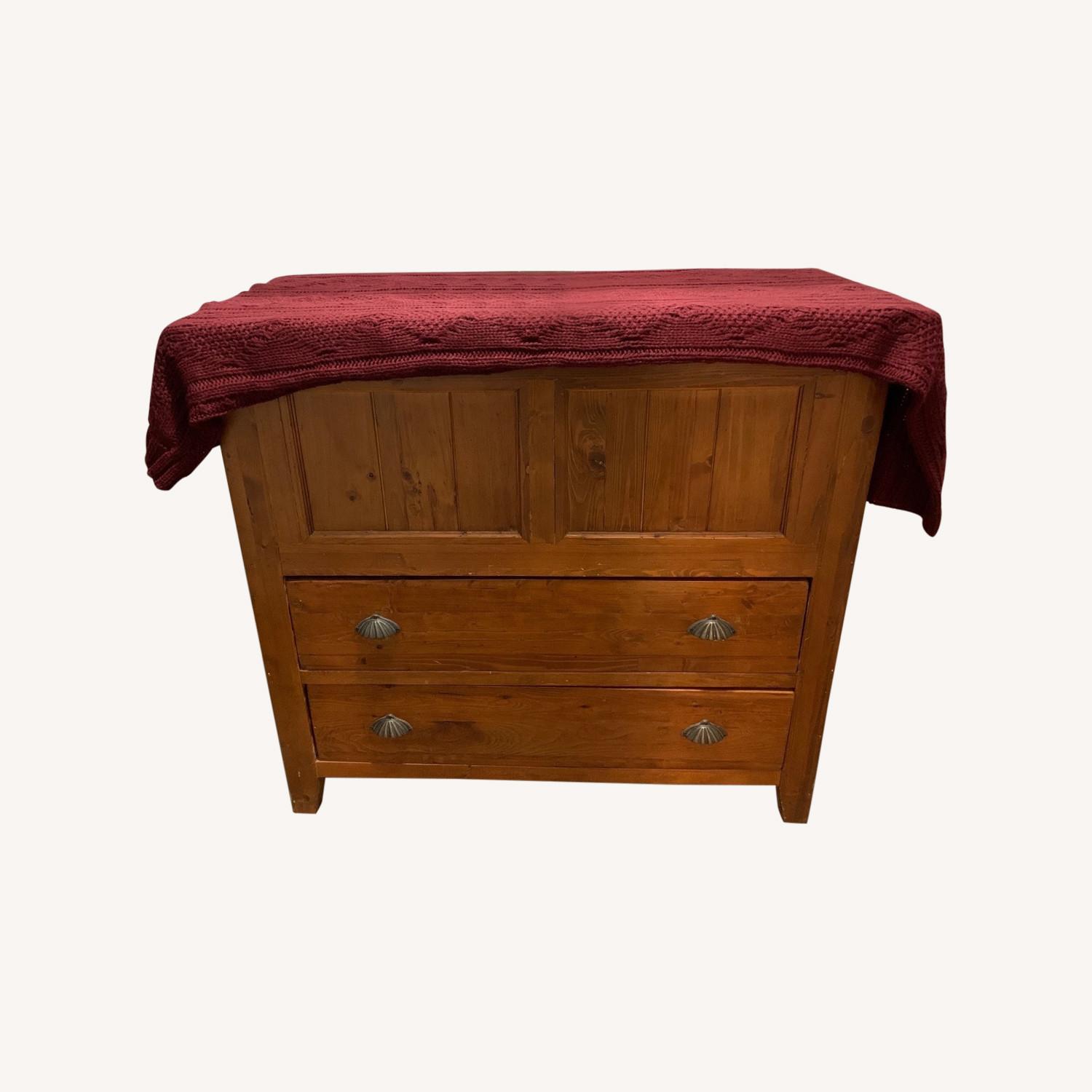 Seller's Notes:Real wood lift up lid and 2 drawer dresser, more for hallway/entrance than bedroom. Very solid and well made, good condition with some nicks here and there. Great for storing outdoor accessories of all kinds, hats, gloves, etc. 42 inches wide, 19 inches front to back, 38 inches tall. Weighs approximately 50 lbs, maybe more - solid piece of furniture. Please look at the pictures. , buyer to pick up. Only selling because we are moving and have no room for it in the new place. Thanks for looking.
