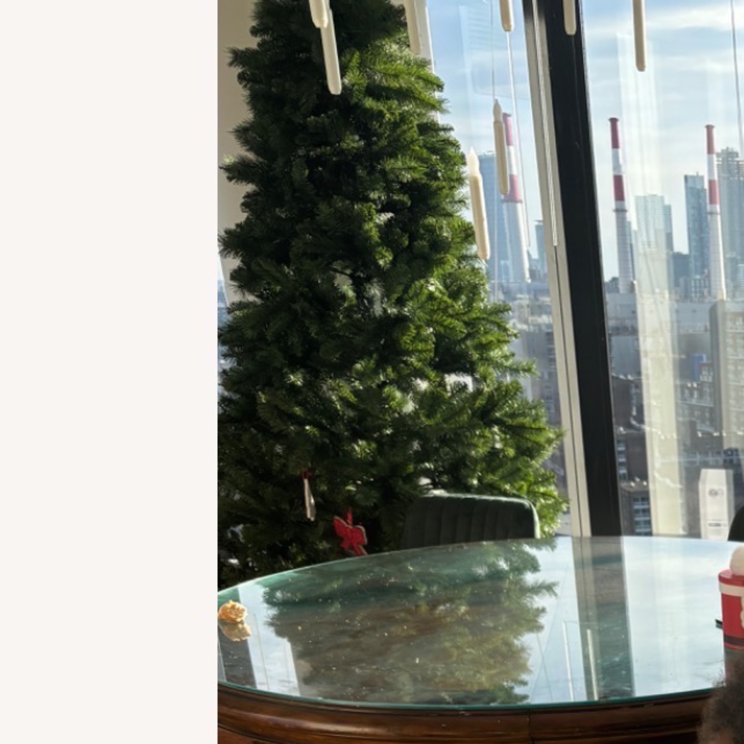 Seller's Notes:Great heavy round wooden table with glass top seats 6-8
