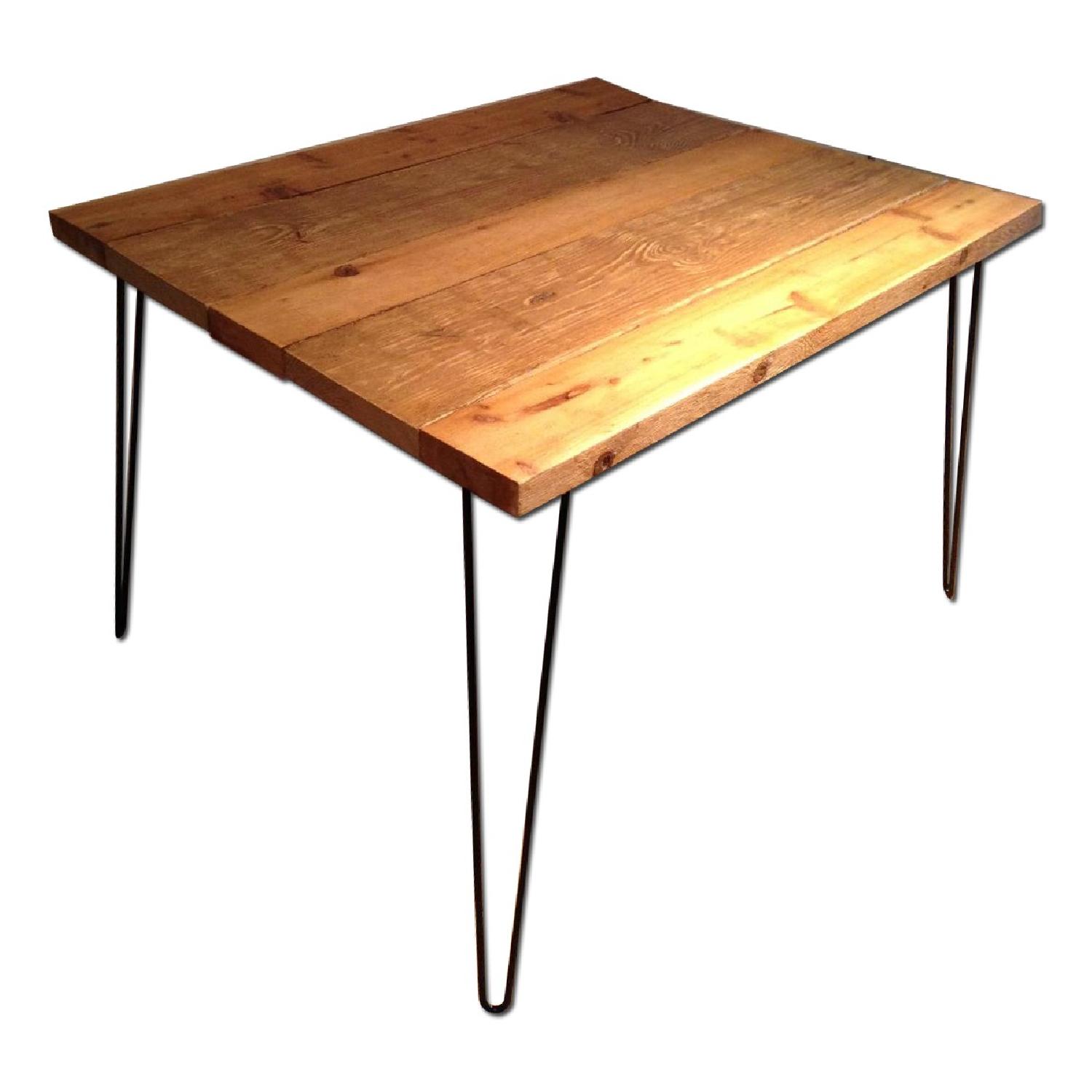 Seller's Notes:This item is a reclaimed cedar wood table with black hairpin legs that is in very good condition and only used for about a month. I purchased it for a kitchen in my new apartment and it's just a bit too big. There is a slight curve on the table as is evident in the pictures, but it just looks normal for a reclaimed wood table. Check out the picture of the laptop over the curve for a good view. It comes with three folding wood chairs (not reclaimed wood, just standard wooden and black folding chairs) that are in ok to good condition. They certain have some wear and nicks in them but are similar style to the table, although the wood is slightly darker. The chairs wobble a little bit but when you still down in them are 100% stable.