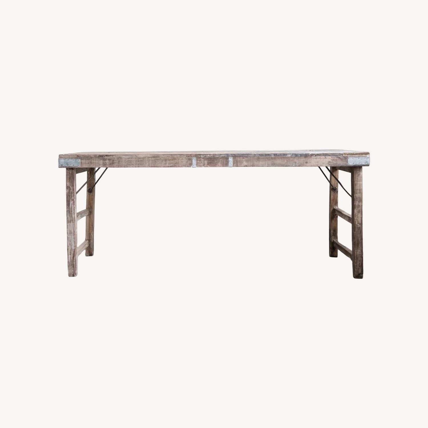 Seller's Notes:Add some rustic and industrial charm to the dining space with this reclaimed wood and tin patch folding table. This table has a long and sturdy design that fits perfectly in any dining room, kitchen, or patio. The table has a thick and spacious reclaimed wood top that can hold up to 275 pounds of décor items, dishes, or plants. The reclaimed wood has a natural and authentic look that adds some character and interest to the table. The table also has a tin patch accent that gives it a unique and vintage touch. The table measures 68 inches in length, 22 inches in width, and 31 inches in height, with two legs that provide stability and support. It can comfortably seat six to eight people, making it ideal for family dinners or gatherings. It can match any style of home décor, from farmhouse to modern to eclectic. This reclaimed wood and tin patch folding table is a long and sturdy piece of furniture that will enhance the dining space with its rustic and industrial charm.