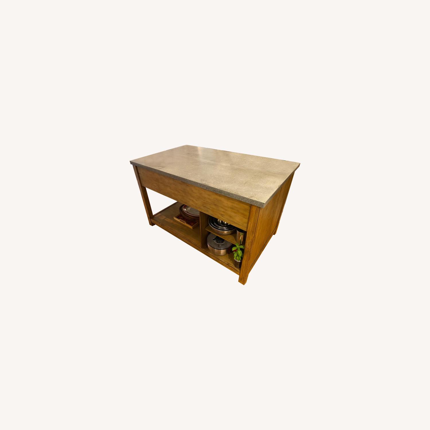 Seller's Notes:We are sadly moving out of NYC and need to sell our amazing kitchen island. It is only 18 months old, made from reclaimed pine, a poured concrete top, and stainless steel finishes. The extendable leaf is perfect for quick dinners if you don't have room for a table in the apartment. There are 3 drawers on one side, and plenty of storage underneath. There is a water stain on one corner, which can be sanded down.