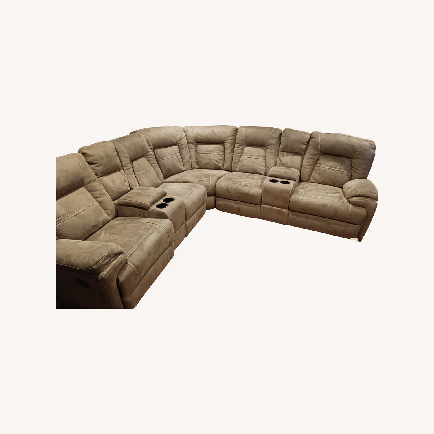 Seller's Notes:2-year-old comfortable reclining sectional sofa set comes with 2 end recliners and 4 cup holders. A comfortable section sofa for family and friends. Sit back and relax. The microsuede/fiber is smooth and comfortable. The mocha coloring is a great match for any decor. Small blemishes on the topside of one of the compartments behind the cup holders.