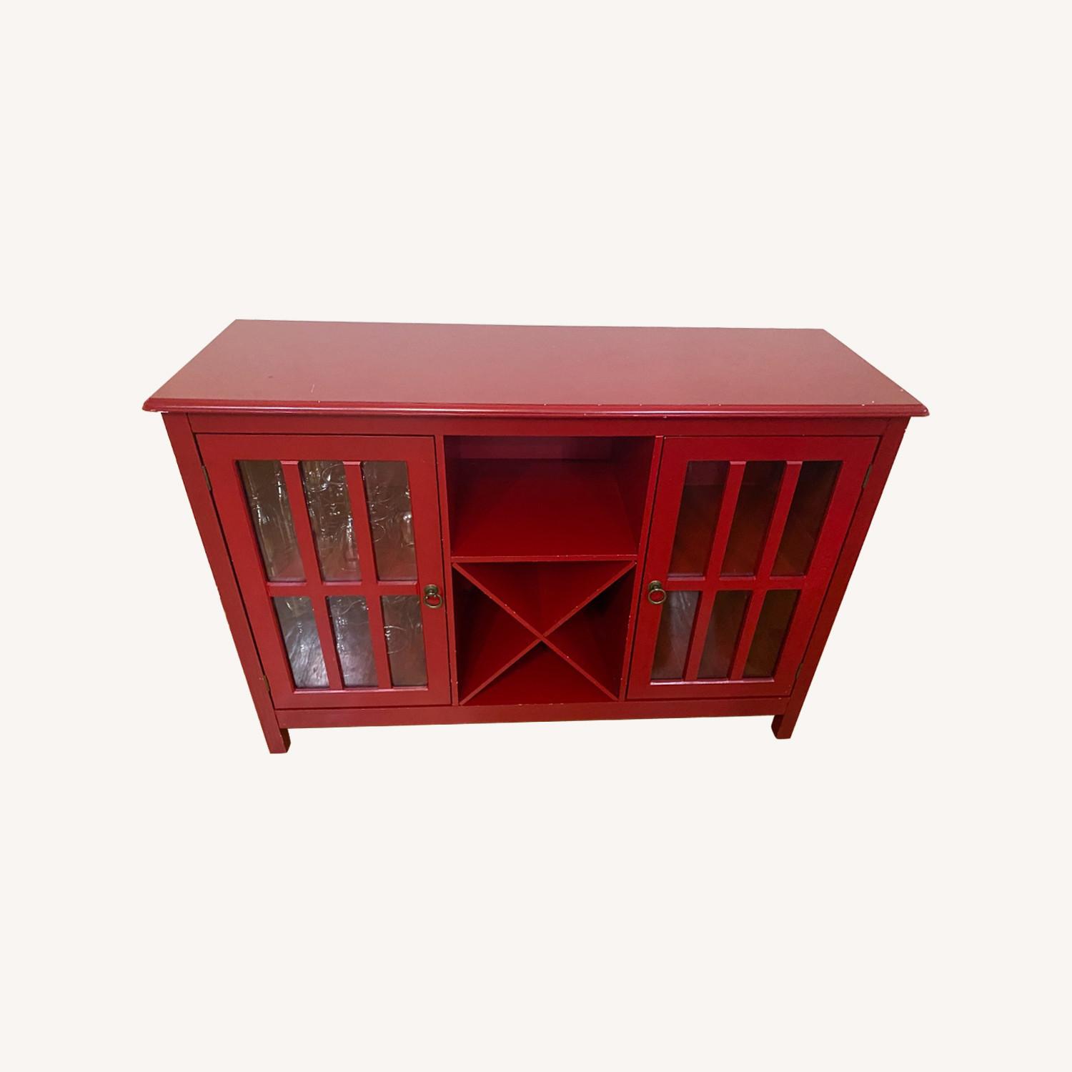 Seller's Notes:This red credenza with glass doors and wine storage has both brightened up our home and added valuable and beautiful storage space. But with little ones in the picture now, we can no longer have glass doors on anything we own! There are a few minor scratches that could easily be covered with a red marker or paint, otherwise in great condition.