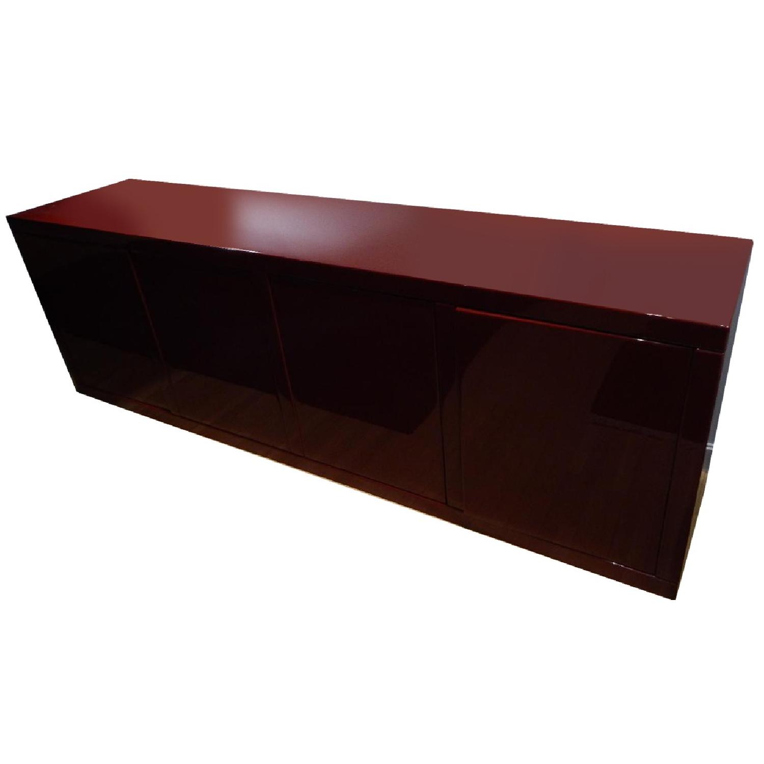 Seller's Notes:Custom made red lacquer sideboard Circa 35 years old With 4 push to open doors and shelving interior Inside label identifies made by S. Portello "Cinistro" 1/2 inch scratch on center back top