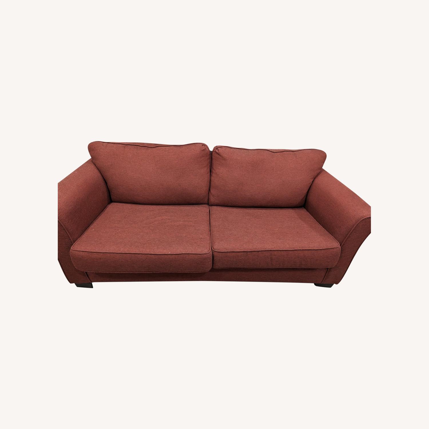 Seller's Notes:This red loveseat from Red Barrel Studio can seat more than two, and rolls out to be a futon bed as well. Has been in seller's home since August 2021. Thankfully, seller's two cats don't scratch furniture, so there are no claw marks and couch is intact.