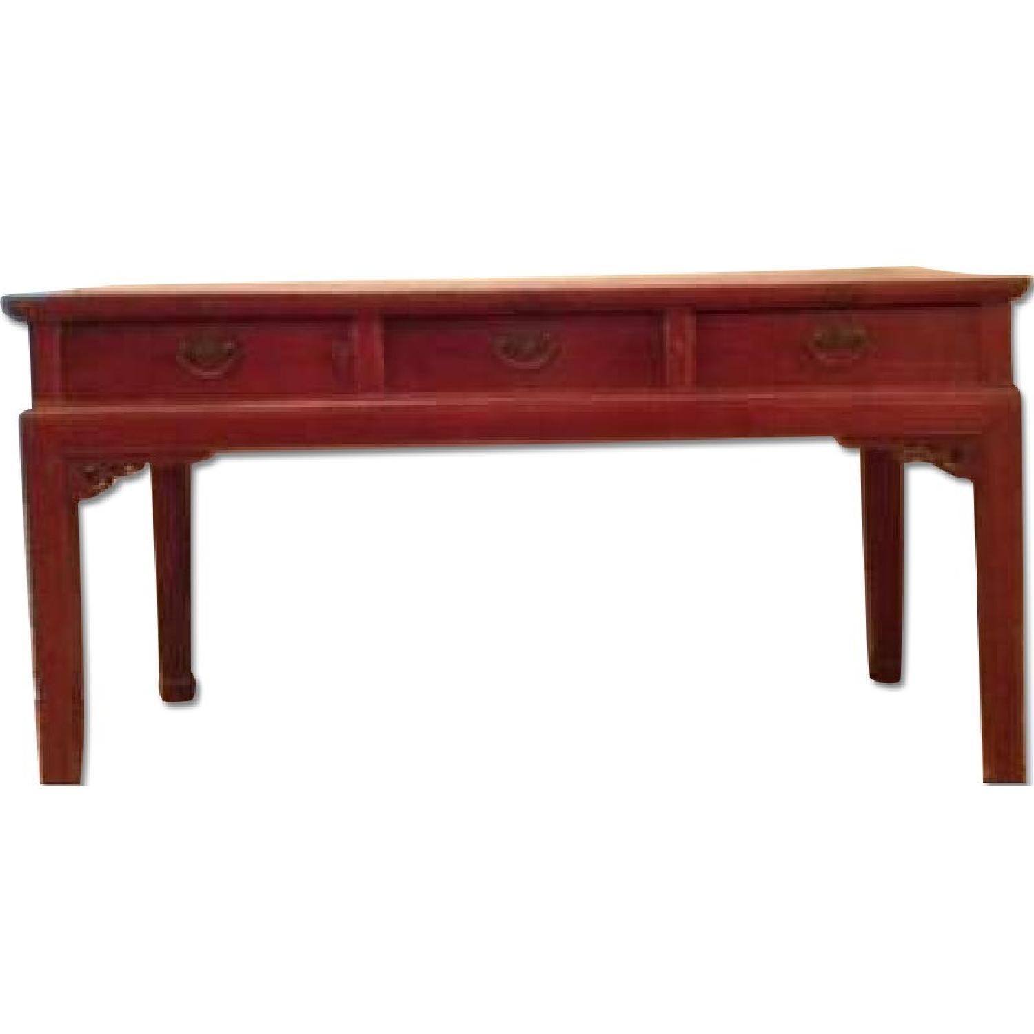 Seller's Notes:Antique red stained Asian inspired table 3-drawer table carved details on legs