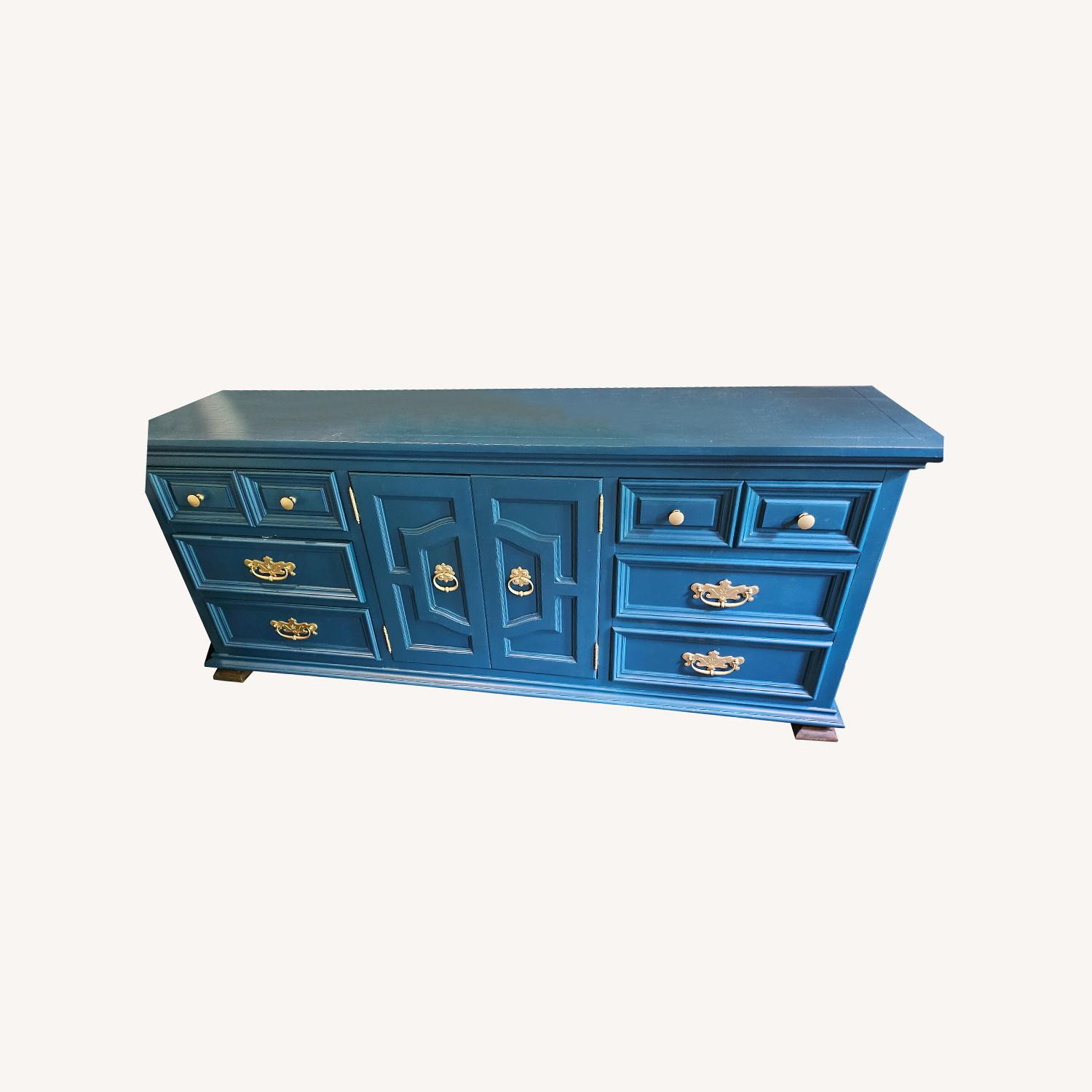 Seller's Notes:It's a beautiful midcentury 9 drawer dresser with a beautiful teal paint and new drawer pulls and custom drawer liners---it's got beautiful detailing outside and in. It's got midcentury modern simplicity and a few flourishes. We bought it from a guy who rehabbed an old, solid wood piece. We're moving and don't have space for it, but it's a lovely piece that we'll miss.