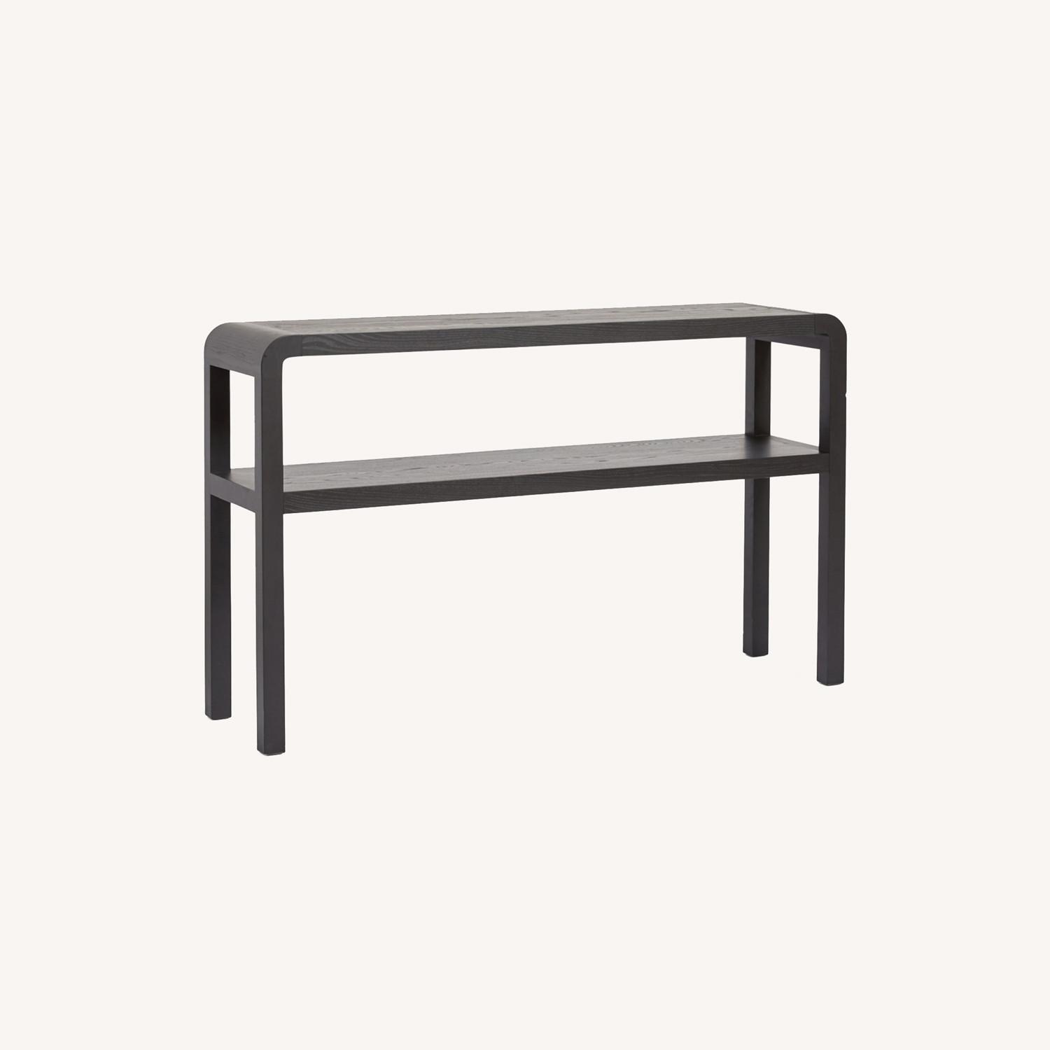 Seller's Notes:This console table is only 5 months old and is in mint condition. PRODUCT DESCRIPTION Curved edges make a subtle statement for our exclusive Woodson console table, which features a lower shelf for additional storage and display. Table is made from solid black ash, offering a beautifully crafted piece that will stand the test of time. DETAILS YOU'LL APPRECIATE Exclusive modern design with curved edges Lower shelf for easy storage and display PRODUCT SPECIFICATIONS Solid black ash Imported