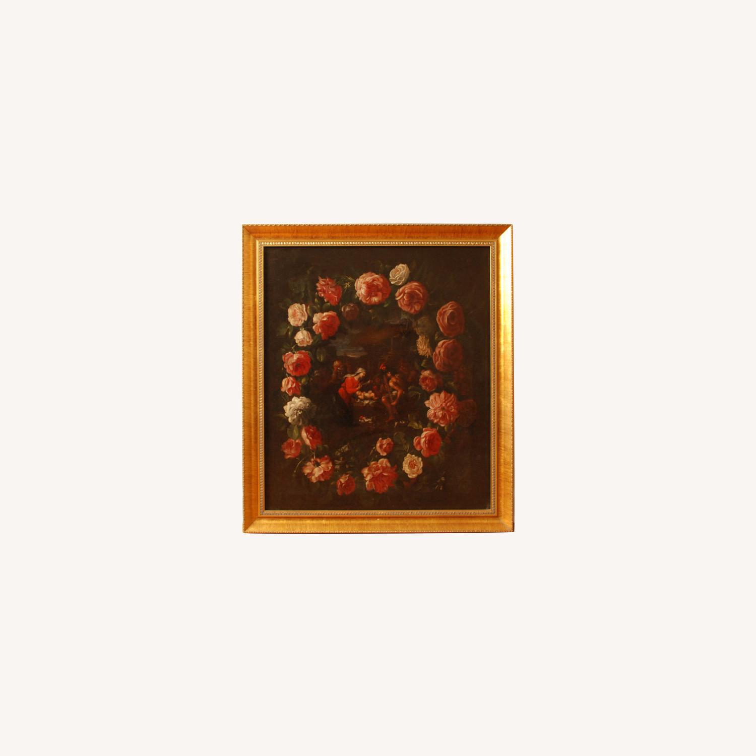 Seller's Notes:Northern Europe Old Master between 1630 and 1750 C.E. In need of minor restoration near the top Unknown artist – follower of Daniel Seghers or School of Giorgione (Zorzo) da Castel – Giovanni Stanchi perhaps. Painting is not signed. The image is during the pre-dawn light, the Virgin Mary is lifting a cover the baby Jesus in the center of the painting. Surrounding them are shepherds in adoration and doves nearby. In the right background is a stable with steps leading up to it with a straw roofing. The Virgin Mary is wearing a red robe with a long white head cover. The whole scene is surrounded by roses and green leaves. With frame, Height 33”, Width 28.1. Without frame, Height 28.12” (71.5cm), Width 24.12” (61.2 cm) Please note that the painting has a small blistered 2.5-inch crack near the top right corner. In 2001 a top figure from the Appraisers Association of America appraised it at $8,000-$10,000. Mid-17th Century Franco-Flemish regarding the nativity and garland sections was his assessment. In 2005 Masterson Gurr Johns Inc appraised it at $6,000 fair market value. Modeled on Flemish prototypes of the early 17th century an Jan Breughel, Jan van Balen or Rubens, the present painting is Italian, the flowers possibly from the circle of the Roman painter Abraham Breughel (1631-1680). As was customary at the time, the figures are probably by another hand. Sotheby’s in Amsterdam offered between 7,000-9,000 Euros for it in 2005. But shipping would have been cost prohibited. The frame is new, but the painting itself is at least 350 years old, and perhaps a lot older. We are selling below the fair market and appraised value to modernize and spring-clean our house. The paining was restored in the 1990s by Victor E. Grace of Grace Galleries, Brunswick ME. He was a fellow the American Institute of the Conservation of Historic and Artistic Works of Art. He was a past member of the American Association of Conservators and Restorers. This is part of a collection of paintings that originate in Florence from a family close to the Medicis, later they moved to Genova where a documented transfer took place in 1852. They came into the family as a collateral for a large loan to the former Genovese family. A copy of the provenance from the Italian with English translation is available. Included documentation of the forensic/scientific dating is part of the package. Forensically Analyzed by McCrone Associates in Westmont Illinois. X-ray imaging was made. Small samples of paint were taken with a fine-point tungsten needle in non-restored areas. The samples were mounted onto glass microscope slides for polarized light microscopy (PLM) analysis and onto a beryllium planchet for energy dispersive x-ray spectrometry (EDS) on the scanning electron microscope (SEM). A portion was also mounted onto a potassium bromide substrate for infrared spectroscopy analysis (IR) of the mediums. Fractions were treated separately with phenol and orthodichlorobenzene (ODCM) in order to separate the medium material from the pigments. The presence of Naples yellow, ground lapis lazuli and other pigments means that this painting is most likely created between 1630 and 1750. The ground layer of ground limestone or whiting is consistent with Northern European as opposed to Italian art. Will include the following: Forensic reports from McCrone Associates Reports and images of the final restoration by Victor Grace Appraisers’ notes Copy of the provenance from the Italian with English translation I inherited this enigmatic work of art. Shipping is free, but if you are within 60 miles of the NYC area, I will personally deliver the artwork along with all the documentation. All part of a set, from an old European family