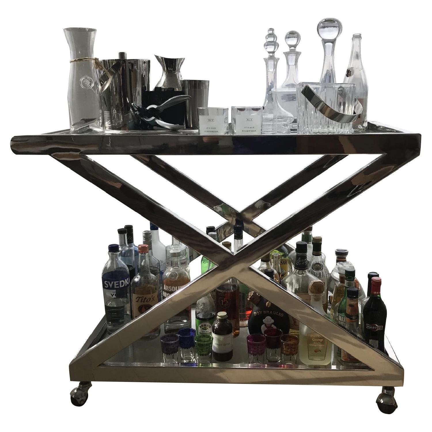 Seller's Notes:Perfect mid century bar cart. Condition is like new. Selling it only because its a little too big for my living room. Color is polished nickel/chrome with glass shelves