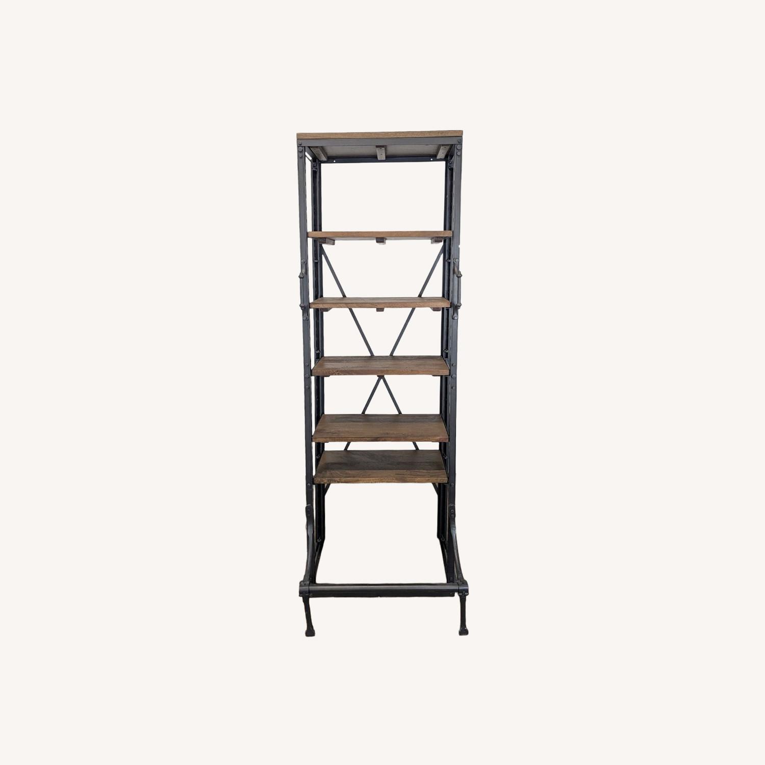 Seller's Notes:Features dark metal frame with five medium-tone wood shelves and a lower metal foot railing with two upper handles