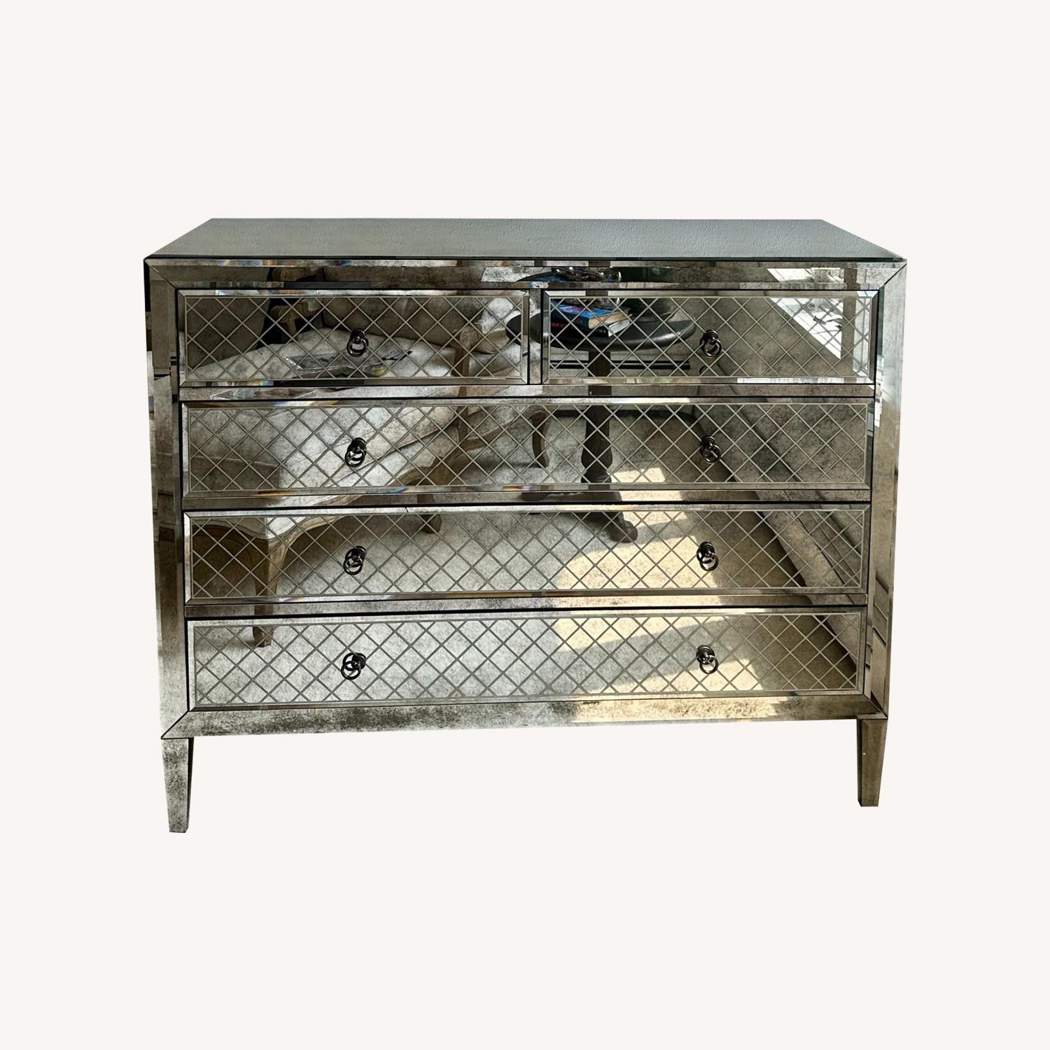 Seller's Notes:Restoration Hardware, excellent condition, 5 drawer antiqued mirrored dresser. Two smaller drawers on top and three larger drawers on the bottom. Beautiful antique mirror. Lots of great storage and can fit in smaller spaces.