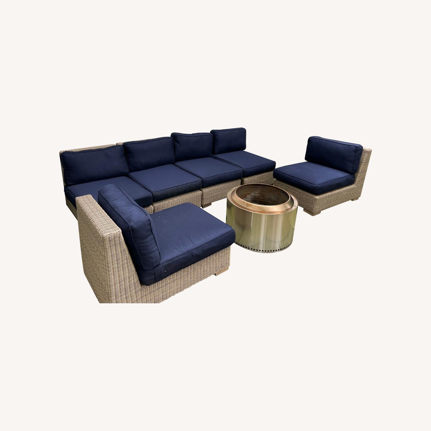 Seller's Notes:This faux wicker outdoor sectional is super functional and can be configured in multiple ways-- large sofa, love seat, lounge chairs, etc. This set was rarely used (only outside 1 summer). The navy cushions are in great shape. My parents are moving and no longer need this furniture so I am selling on their behalf.