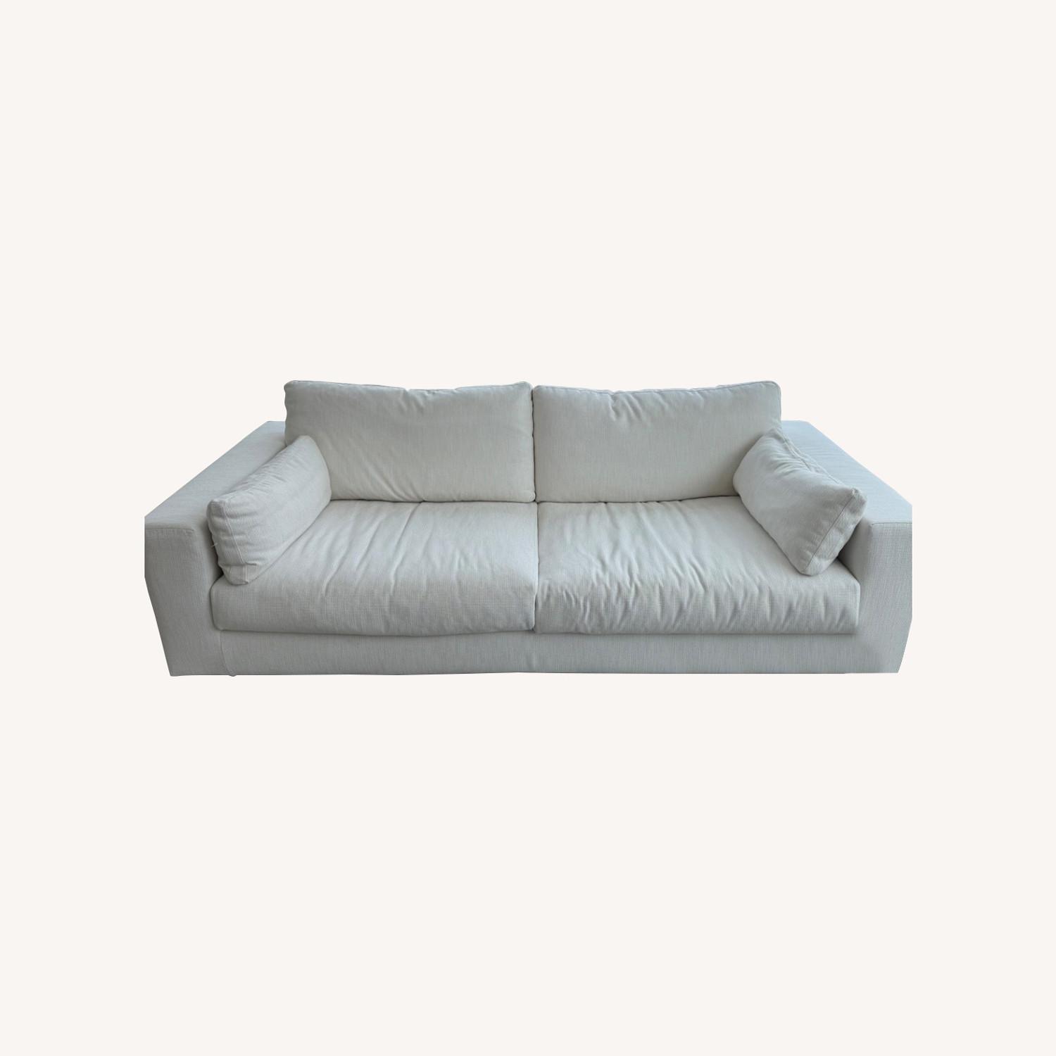 Seller's Notes:Beautiful, custom-made Restoration Hardware (RH) Lugano sofa Delivered brand new in December 2022 Fabric is Perennial Performance Textured Two-Tone Linen (natural color) Fill is down feather Dimensions: Length: 96” Depth: 46" (Luxe Edition) Height: 32.25" Frame Height: 23.75" Seat Height: 17" RH configuration: 10071984 WHNT Couch doctor will be provided