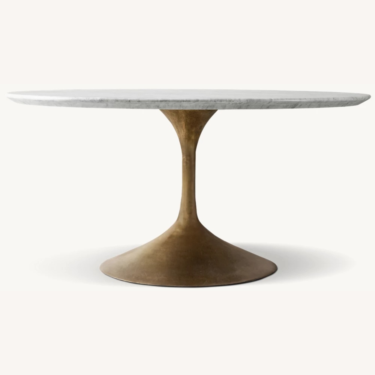 Paying homage to the sweeping lines of midcentury furnishings, our table is a study in simplicity. Defined by its balanced proportions and arching, sculptural curves, our interpretation pairs a cast steel pedestal base with a beveled-edge marble top.