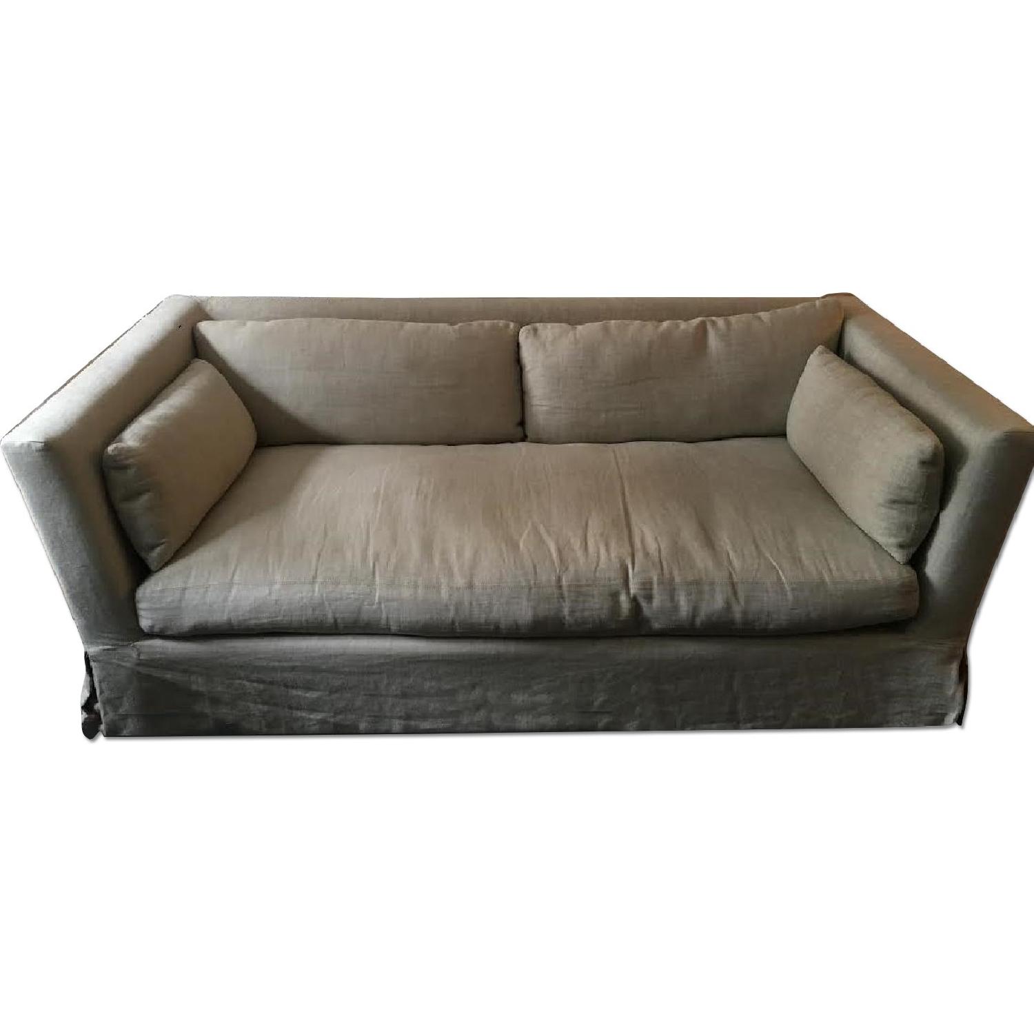 Seller's Notes:Restoration Hardware 7-foot Belgian Shelter Arm Sofa. Upholstered in slip-cover linen. Per the RH website, the color is "Sand", the cushion fill is "Down Feather" and the depth of the couch is the "Luxe" extra deep. The couch is in excellent condition - no spills or stains. If purchased new from Restoration Hardware this couch retails for $3,250. If you purchase the new RH Grey membership for $108, you receive 25% off, bringing the price down to $2,437. Adding in the $199 RH charges for shipping and $234 of taxes, the total price to buy this couch new is $2,978. Need to sell because we are getting another couch. Here is the link to the couch on RH's website: https://www.restorationhardware.com/catalog/product/product.jsp?productId=prod520010&categoryId=cat80010