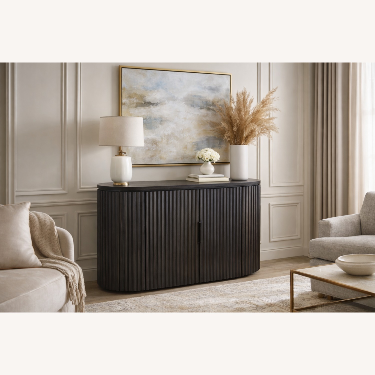 Wear and tear details: Manufactured in June 2024, this Byron 2-Door Sideboard is an open box piece. The Black Oak finish presents beautifully overall, with crisp vertical reeding, consistent color, and clean lines across the cabinet. The doors align properly and open smoothly,