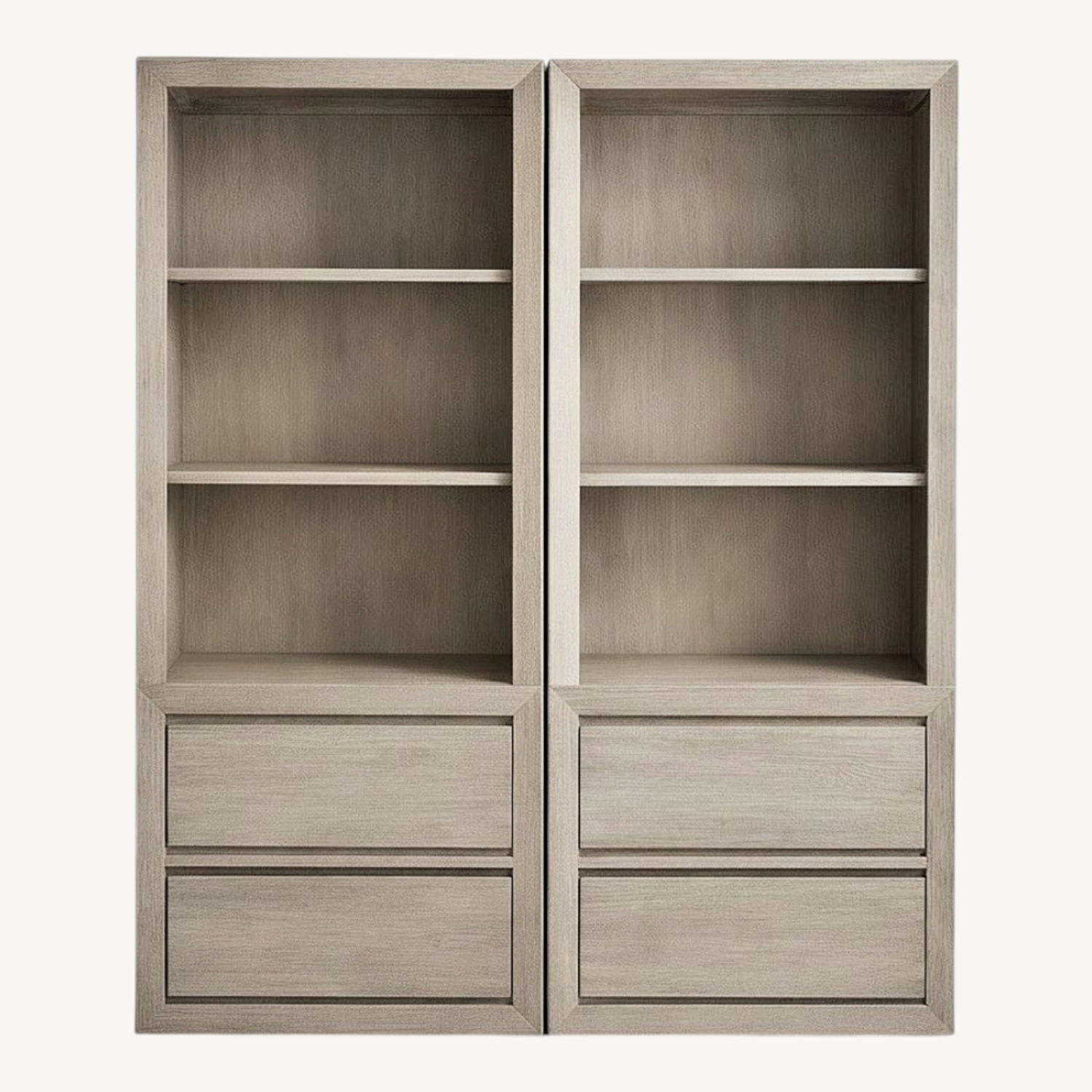 Seller's Notes:Absolutely gorgeous "Callum" storage set (2 tower book cases, 1 media unit) in Sandwashed Grey. Bookcase towers are each outfitted with 3 adjustable shelves and 2 adjustable shelves in cabinet. Pristine / like new condition. See link for detailed dimensions.