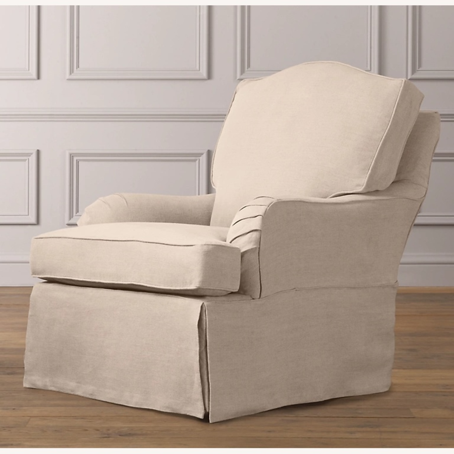 Seller's Notes:Classic custom yet contemporary down fill, washed Belgian linen Swivel Glider in dove grey color with self piping. Features a gentle camelback silhouette, pleated English roll arms and a smartly tailored slipcover with a corner-pleated skirt and are rolls. Its enduring style and plentiful comfort make it a welcome addition to the nursery and beyond. Retail value $1975. Will need to be reupholstered or a new slipcover from RH purchased (they are available).