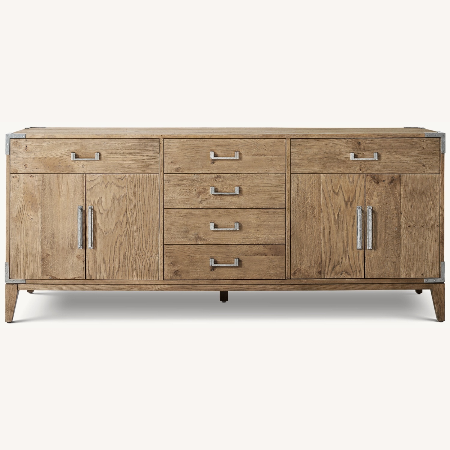 We are selling our Cayden Campaign 4-Door Dining sideboard in natural oak wood with bronze hardware. It's a piece in excellent condition that we have used for storage in our dining area. There are no imperfections. From the Restoration Hardware website: