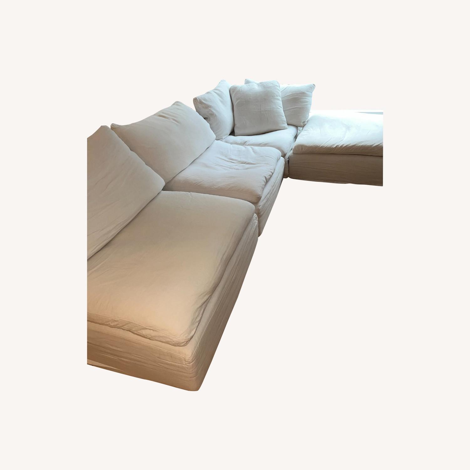 Seller's Notes:Restoration Hardware Cloud Couch, White Washed Belgian Linen We absolutely love this couch. Most comfortable couch I've ever had or sat on! Unfortunately, it doesn't fit in our new apartment so we have to part with it. No visible stains, slipcovers are washable We have no kids or pets Width 132 inches Depth 45 inches With ottoman depth 90 inches Cloud Modular Slipcovered Corner Chair DEPTH: Luxe 45" FABRIC: Washed Belgian Linen COLOR: White Cloud Modular Slipcovered Armless Chair DEPTH: Luxe 45" FABRIC: Washed Belgian Linen COLOR: White Cloud Modular Slipcovered Armless Chair DEPTH: Luxe 45" FABRIC: Washed Belgian Linen COLOR: White Cloud Modular Slipcovered End-Of-Sectional Ottoman DEPTH: Luxe 45" FABRIC: Washed Belgian Linen COLOR: White